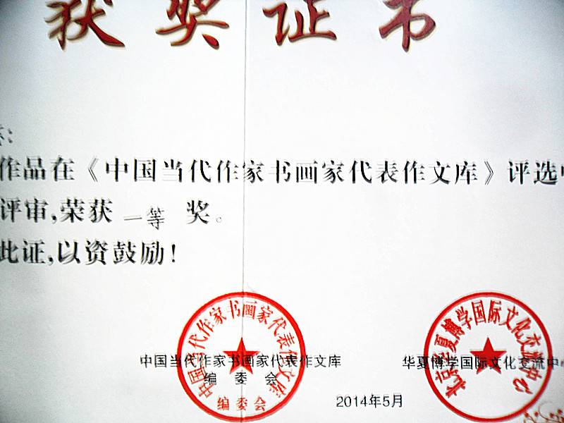 中国当代作家书画家代表作文库编委会及北京华夏博学国际文化交流中心进行的《中国当代作家书画家代表作文库》评选中,陈德孝作品获一等奖。