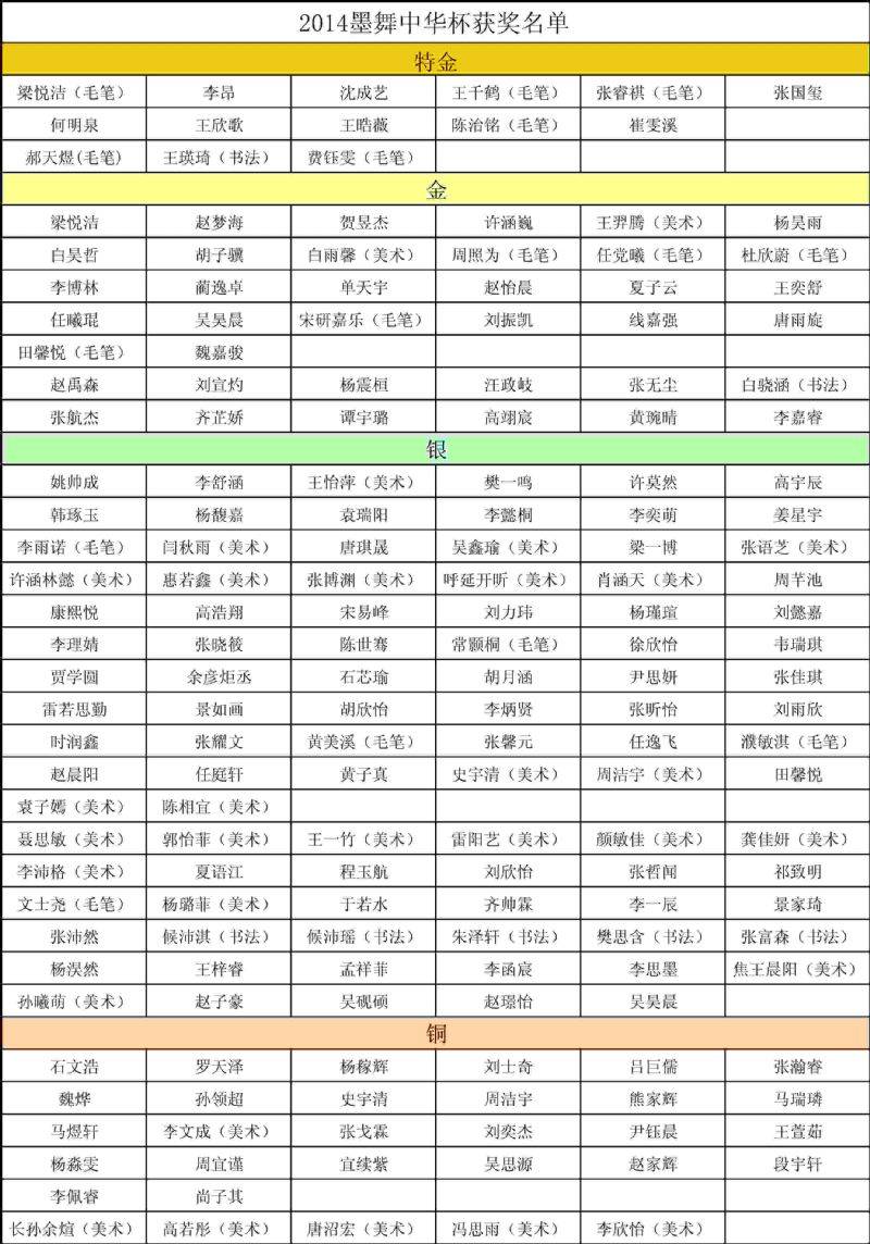 此次参加“墨舞中华杯”全国首届青少年美术书法大赛,我校的335名学生表现优异,至今为止获特金奖14枚、金奖38枚、银奖97枚、铜奖48枚。特向各位学员及家长朋友报喜,希望同学们再接再厉,再创辉煌!