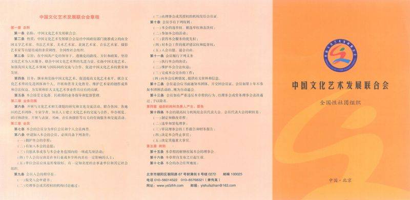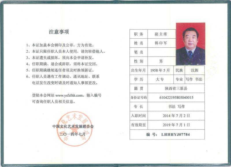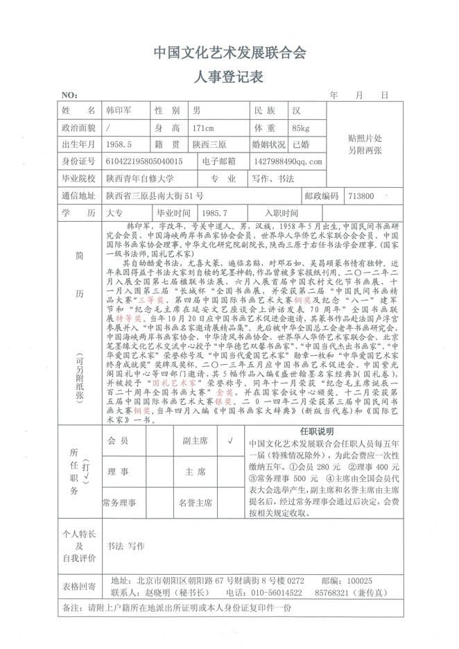 中国文化艺术发展联合会是经中国政府部门批准成立的全国文学艺术家、书法艺术家、美术艺术家、表演艺术家、音乐艺术家、摄影艺术家等自愿结成的非营利性、全国性社团组织。宗旨是:在中国共产党的领导下,遵循党的路线、方针和政策,坚持文化艺术为人民服务,联合中国文化艺术界的先进力量,弘扬中国文化艺术,加强中国文化艺术领域与国际间的交流与合作,促进中国文化艺术的繁荣和发展。并接受国家文化部、国家民政局的业务指导和监督管理。目前,经中国书法网等相关部门推荐选举,三原书法家韩印军荣幸当选为该会副主席。本会的主席由通晓诗词歌赋的中国书画篆刻艺术研究首席专家李燕生担任,名誉主席为中国著名表演艺术家李雪健担任。另有两位副主席杨银涛、丁建中负责主持驻会工作。近日,相关办公用品已发放到位,韩印军先生已着手开展工作。