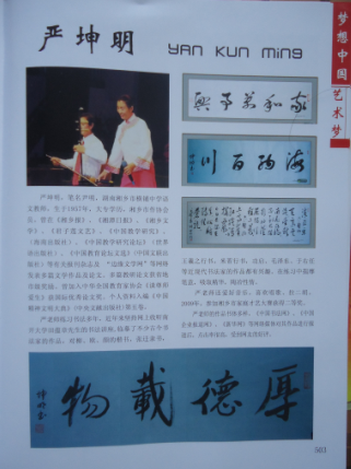 《梦想中国》(中国文联出版社)收录了我的作品。让我见到了全国各行业的优秀人物。相比之下,我感到惭愧。工作人员曾说这书由中央文献出版社出版。结果变了。个中原因不得而知。虽然都是国家出版社,但总觉得有点蹊跷。不过,就我来说,并不遗憾。隐约觉得,虽然或多或少上账受骗,但自己毕竟在网络中成长,从众多的名家那里吸取着营养,或许这也叫做有失必有得吧。别说我这样一个普通的书法爱好者具有这样的经历,就是大师名家或许也难逃上当的厄运。南开大学著名教授田蕴章先生也说自己经常受骗。所以我认为,我们在从事艺术创作中,必须理智对待别人的评说,不能不自觉的掉进陷阱。
