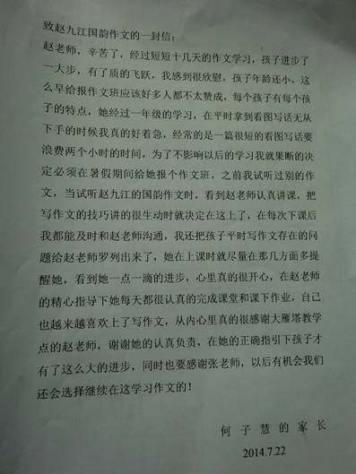何子慧家长的来信,信上家长主要对学校以及赵老师的辛勤工作表示了衷心的感谢,虽然信