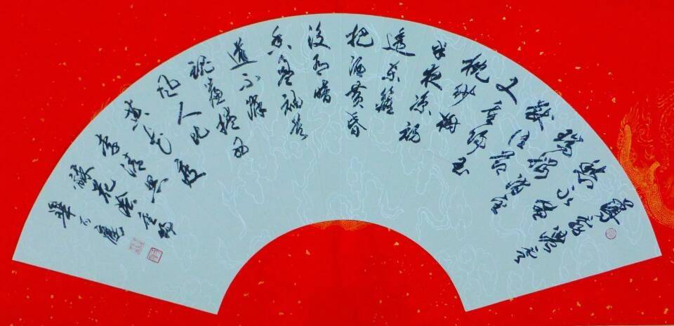 8月22日,中国政法大学书法教师毕可鹰收到中国书法网微信扇面奖品(安徽御宝阁宣笔)之后,立即泡开毛笔,注水研磨,试验毛笔质量。 其蘸墨书写扇面后,给我们发来作品,他的评价是: 齐圆尖健,四德尽显,纵横驰骋,无不如意!