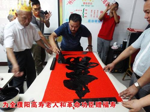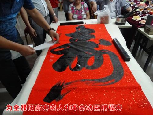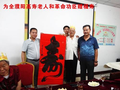 我市书法家中原书龙第一人刘石刚为全体寿星现场书写“福”、“寿”,寓意要“福”得“福”,要“寿”得“寿”,“福”“寿”相连,恭祝寿星们福如东海,寿比南山!老人们纷纷称赞刘老师的书法功底深厚,字字铿锵有力,并要求与刘老师合影留念。