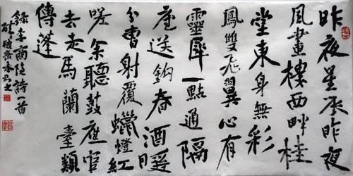 在毛笔字基本退出实用,书法进入纯视觉艺术时代的今天,我总结出了我个人的书法艺术品评价标准:章法占60分;笔法占15分;字法占15分;墨法占10分。此处的章法是指观者站在能够对作品全貌一目了然地位置,把整幅作品当做一幅画或者一个字来对待,如果从大局观看,整体感觉非常美,就能得60分,就已经及格了。就如同一支队伍,全队队员团结齐心,就一定不容小觑,就已经堪称是一支队伍了,至于战斗力的强弱,再往下看。笔法指中锋用笔水平的高低,在各种丰富笔势变幻中,始终能够保持中锋不变则得15分,侧锋则得0分。字法指碑帖传承和字理积淀,有由、得当则得15分,无由、生搬硬套则得0分。墨法指驾驭水性、墨性、纸性的能力,以及对环境湿度、温度的关照,甚至对自身呼吸的掌控,这些功夫,关乎最后10分,得失在毫厘之间,颇为难得。