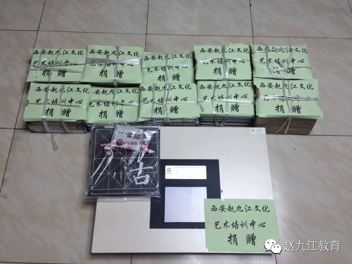 活动中赵九江校长向大明宫小学赠送价值9000余元的硬笔字帖360本、投影书法临摹桌1台、练字本90本。