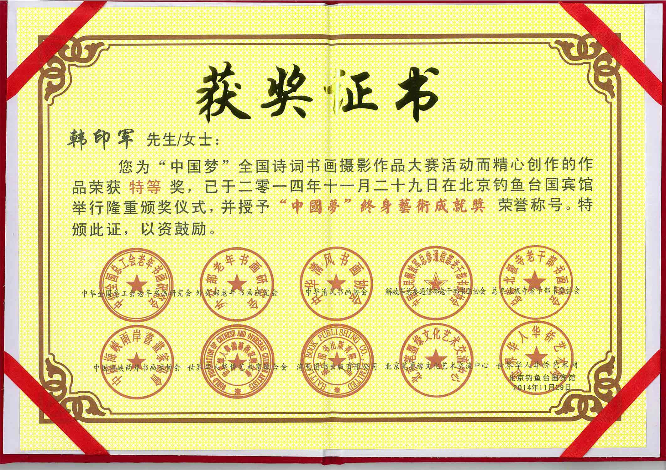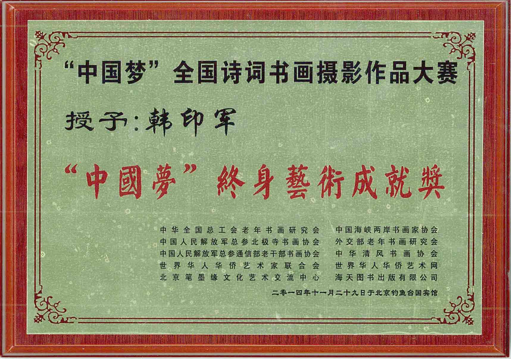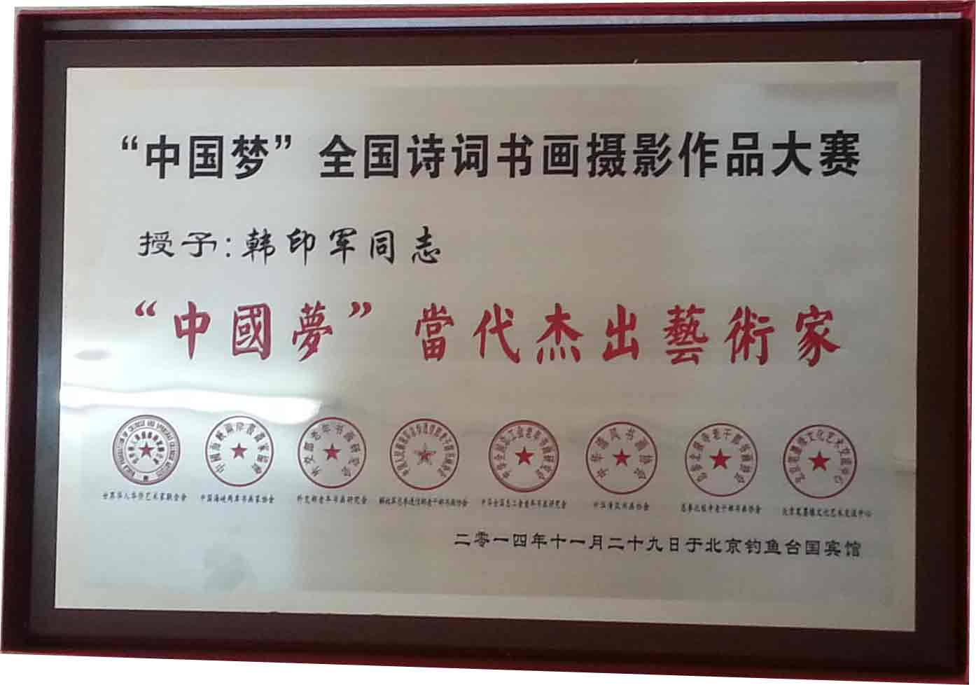 本报讯:(记者:秦戈)近日,由中华清风书画协会,中国海峡两岸书画协会,世界华人华侨艺术家联合会、北京笔墨缘文化艺术交流中心等十部门联合举办的“中国梦”全国诗词书画摄影大赛揭晓。三原县书法家韩印军斩获头筹。他参赛的作品是六尺大篆四条屏,为习近平总书记词《念奴娇·追思焦裕禄》。同时,大赛组委会还授予韩印军“中国梦”当代杰出艺术家和“终身艺术成就奖”荣誉称号,并被邀于2014年11月29日在北京钓鱼台国宾馆颁奖。