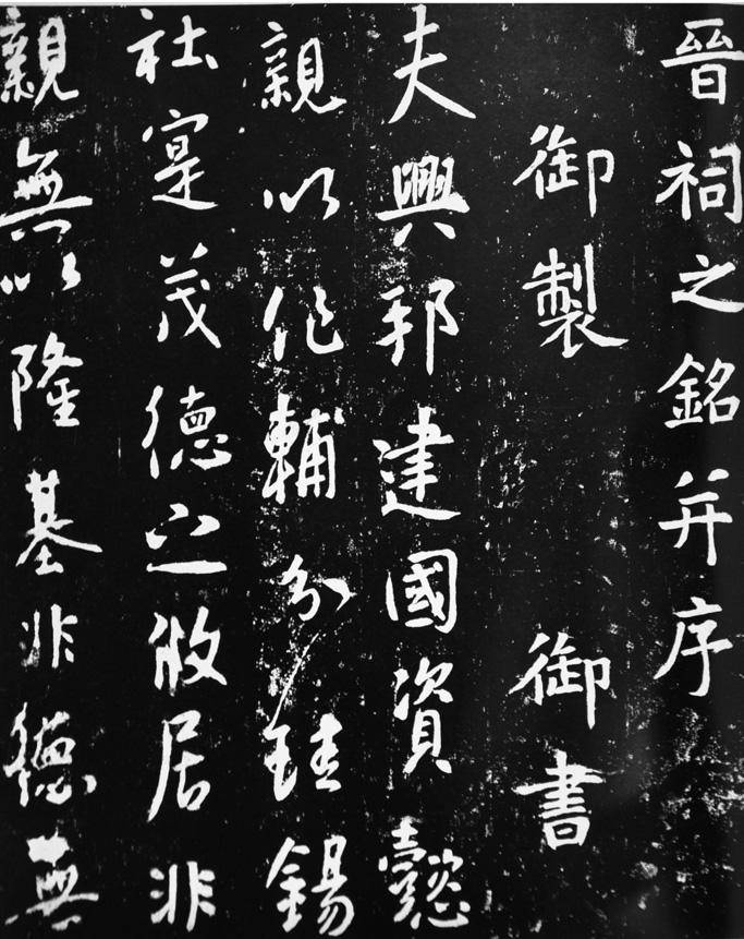 《晋祠铭》全称《晋祠之铭并序》,唐太宗撰文并书。碑高195cm,宽 120 cm。 碑额高 106cm。方座螭首额书飞白体“贞观廿年正月廿六日”。碑现存山西太原晋祠贞观宝翰亭内。此碑行书 28 行,每行 44 字至 50 字不等。从艺术风格来看,当属李世民学习研究王羲之书法的代表之作。其书作被宋代朱长文列为“妙品”,并在其《续书断》中这样评价唐太宗的书法:“翰墨所挥,遒劲妍逸,鸾凤飞歙,虬龙腾跃,妙之最也。”