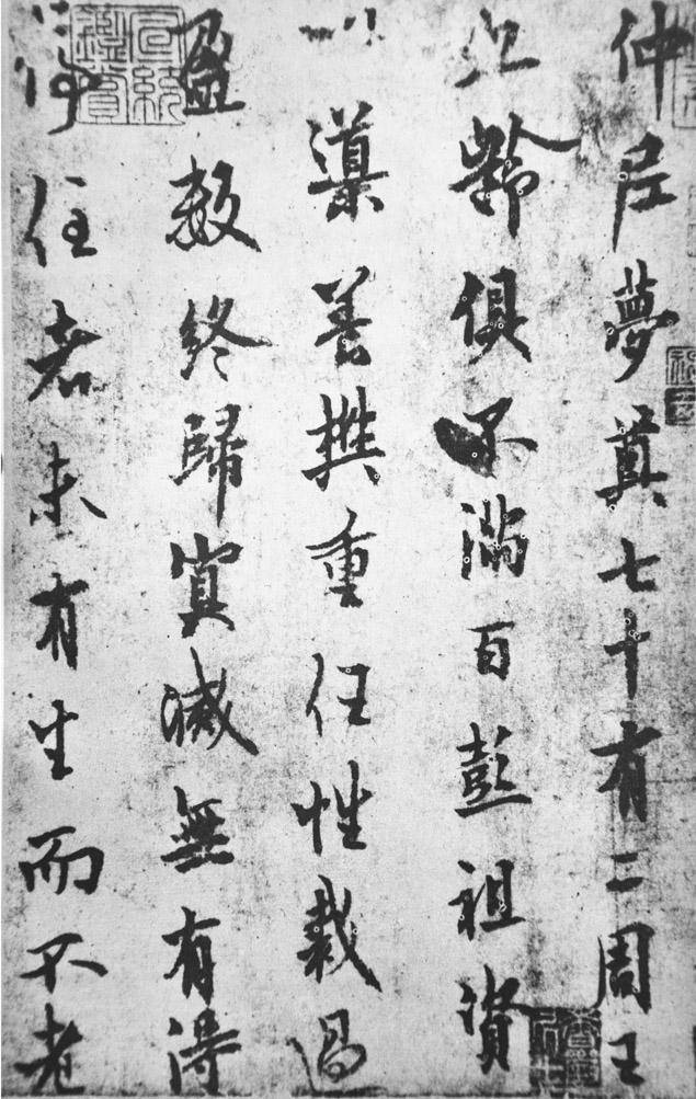 《仲尼梦奠帖》无款,传为欧阳询所书,亦有人怀疑是摹本。此帖为纸本,宽 25.5cm, 长 16.5cm,共 9 行,计 78 字。此帖曾入南宋内府收藏,钤有南宋“御府法书”朱文印记两方,“绍”“兴”朱文连珠印记,后经南宋贾似道,元郭天锡、乔篑成,明杨士奇、项元汴,
