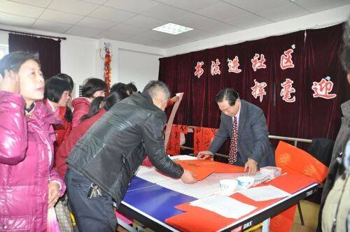 书法家到农村,进社区为群众写春联送祝福,成为一道亮丽的民俗文化风景线。正如书院镇社区生活服务中心负责人说:“书法家们每写完一幅春联,都赢得了一阵阵喝彩声,不时的叫好声和火红的春联给我们书院镇社区服务中心平添了一份热闹和喜庆。我统计了一下,活动现场共送出春联和书法作品近70件,拿到作品的市民个个心里乐滋滋、喜洋洋的。真的感谢杨永法、斯华申两位书法家给我们送来的文化大餐。”
