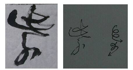 再从力学的角度讲,练好太极拳的缠丝劲对实现书法的苍劲有力也十分重要。太极拳的缠丝劲是一种螺旋形发力的巧劲,也叫游丝劲,具有外圆内方、外柔内刚的特性。这种劲练起来是以躯干的螺旋缠绕来主宰四肢的螺旋缠绕,久练会内气充满,劲贯四梢,击发力极强。通过练太极拳掌握这种劲力对增强书法“遒劲感”和“力度美”的作用是不言而喻的。太极拳缠丝分顺逆两种,顺缠丝为静合,是一种向心的力,致“圆”“柔”; 逆缠丝为动分,是一种离心的力,致“方”、“刚”。书法运笔路线就像太极拳缠丝,正旋画圈犹如太极拳中的正云手顺缠,反旋画圈犹如太极拳中的反云手逆缠。比如 “憂”字:(示意图)