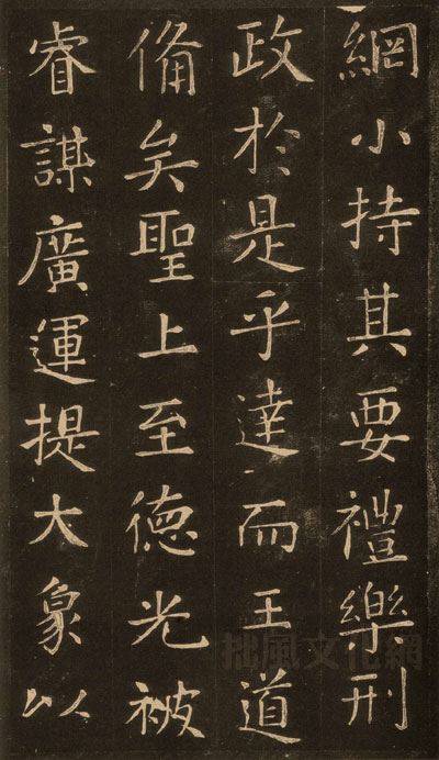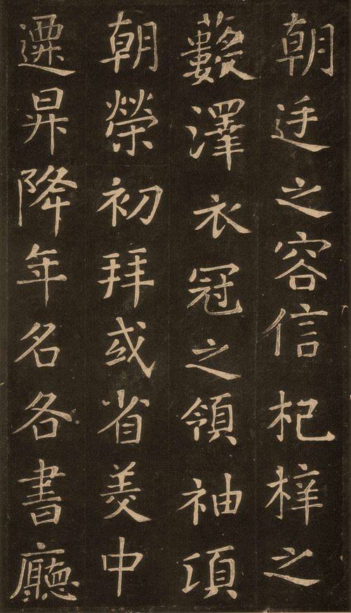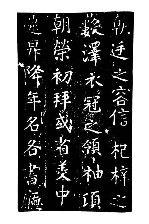 在结体上,此帖上下比例约为 4:5,十分秀美。虽为楷书,但点画结构时时有所变体和调整,从而丰富了楷书的表现力,增加了该帖的审美价值。如附图第一行中的“容”字,其宝盖头的第二点被一短撇(或称为一斜点)代替,如钢刀利刃一般,让人耳目一新,久久不忘。
