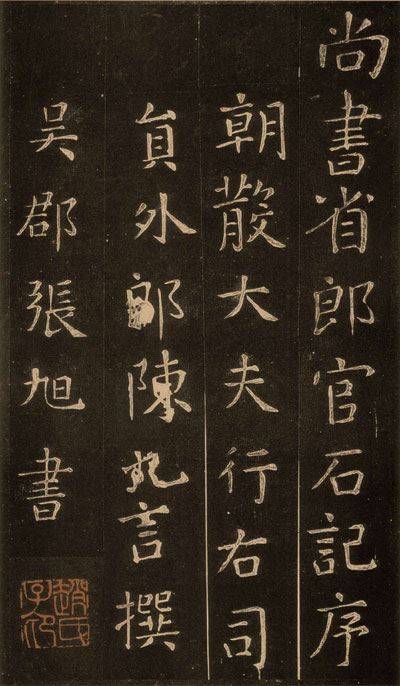 《郎官石柱记》亦称《郎官石壁记》、《郎官石记》、《郎官石记序》,唐陈九言撰文,张旭楷书。唐开元二十九年(741)立于陕西西安。原石已佚,传世仅王世贞藏“宋拓孤本”,拓本现藏上海博物馆。