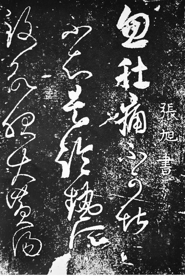 张旭的草书,异于群伦,往往是在酒酣时泼墨,以酒助兴,所以常常自有新意,别出心裁。其字作肥劲之笔,呈瘦细之姿,愤世嫉俗,恣情肆意,甚至有狂颠之态。宋朱长文《续书断》将他的草书列为神品。唐时,人们把李白的诗歌、裴旻的剑舞和张旭的草书并称为世之“三绝”。张旭曾自言说,草书从舅父陆彦远(陆柬之之子)处得二王笔法,又说“见公主担夫争道而得笔意,闻鼓吹而得其法,观公孙大娘舞剑器而得其神,”这道出了张旭书法的渊源,也告诉我们一个道理,即学书要触类旁通,书法水平的高低有赖于其他艺术修养的积累,如果没有精深的整体的艺术修养,要创造出独具一格并能流芳千古的书法作品是不可能的。正因为有整体艺术修养作为积累,张旭才能在书法创作中集自然万象的精华,将唐代的草书推向顶峰,才能得到“草圣”的美誉。