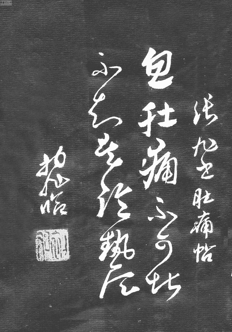 《肚痛帖》为单刻帖,无款,传为张旭所书。草书6行,共30字。因首行有“肚痛”二字而得名。