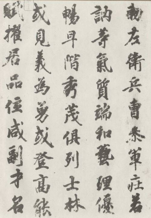 在用笔上,以藏锋为主,追求骨力的险峻。运笔迟涩顿挫,大有力透纸背之势。如附图中的“质”、“艺”、“优”等,但也不是一味追求强劲,同时也注意字态的妩媚与秀丽,在点画上运用了圆笔和露锋,从而使字在强劲中抛散出几分姿容,如第十行的“兵”的最下两点,第三行的“列”的下半部。