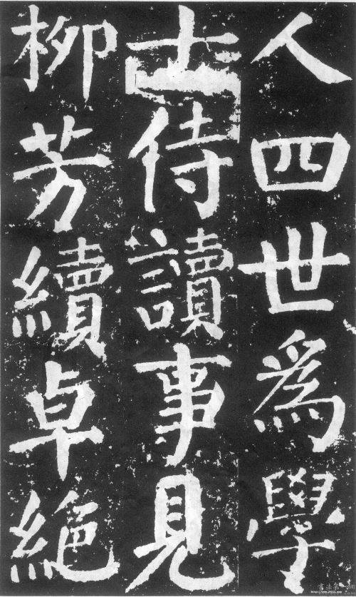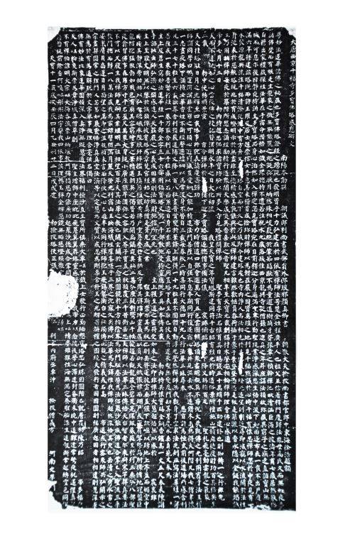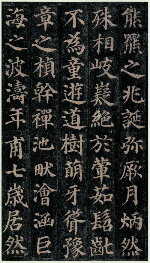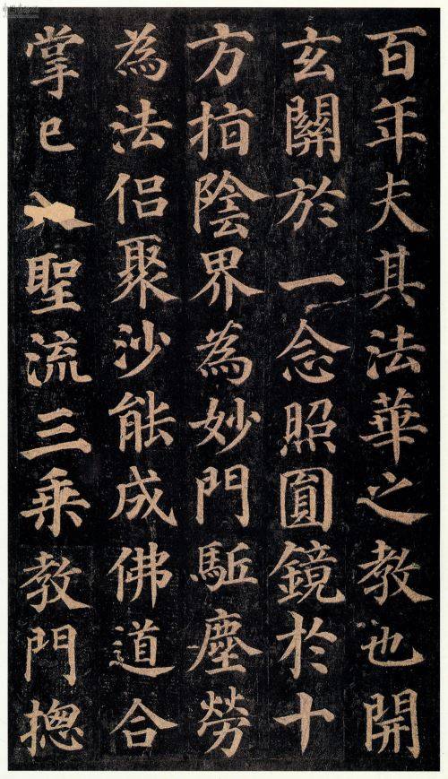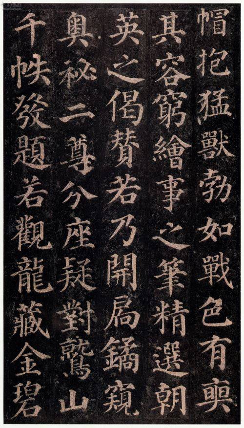 因为在用笔上的多变和结字的丰盈,《多宝塔碑》在章法布局上则相对显得拘谨和工整一些,追求一种机械的平衡。通篇行行字字相对,上下左右,各字之间的行距、字距均等,如一个整齐的方阵,以至于横看、竖看、倒看、斜看皆成行。这在历代楷书中是不多见的。这种方阵式的章法倒也与其秀美的字体相得益彰。