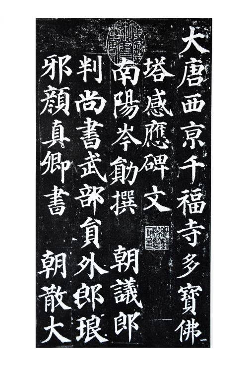 《多宝塔碑》全称《大唐西京千福寺多宝佛塔感应碑》,唐岑勋撰文,徐洁题额。楷书34行,每行66字,为颜真卿44岁时所书,是颜真卿遗世碑帖年代最久远的一部。碑为唐天宝十一年(752)立,现存陕西西安碑林。
