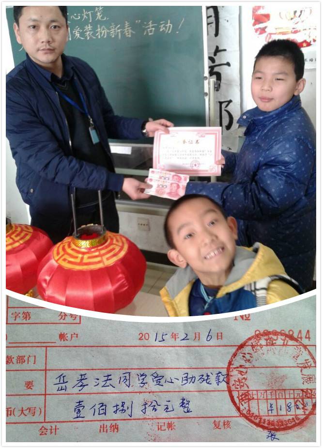 我校于2015年2月3日开展了“义买爱心灯笼,用爱装扮新春”活动。活动一经开始,各校区同学们积极踊跃参加,短短几天时间,所有爱心灯笼被一抢而空。我校全体教师代表做灯笼的智障儿童及张园长向参与本次活动的老师及学生致敬!最小的善行胜于最大的善念。同时对家长们的支持表示感谢!我校因有这么多富有爱心的小学员而感到骄傲!