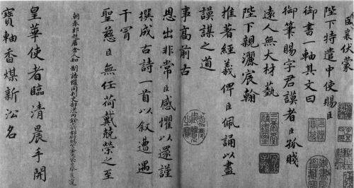 欧阳修在评论蔡襄书法时,把其行书列为第一,而陶宗仪在《书史会要》中也持这样的见解。他说蔡君谟行书“在前辈中自有一种风味,笔甚劲而姿媚有余”。从《蒙惠帖》看来,蔡襄的行书的确造诣极深,秀媚姿荣而透出一股灵气,令人感到美不胜收。