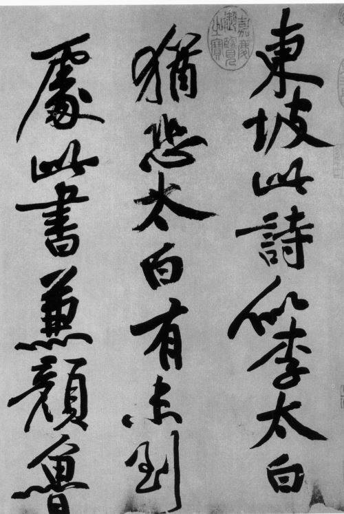在结体上,黄庭坚汲取了《瘗鹤铭》宽松式的优点,创造了放射型结构,使得全篇神情饱满,血脉畅通,如附图中的“东坡”、“笔意试使”等字都是这种放射型的结构典型。这种结构打破了字距行距间的界限,全篇浑然一体而又有序分离,给人以亲切感和随意感,而这正是山谷所要追求的禅机与悟道。
