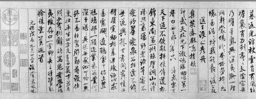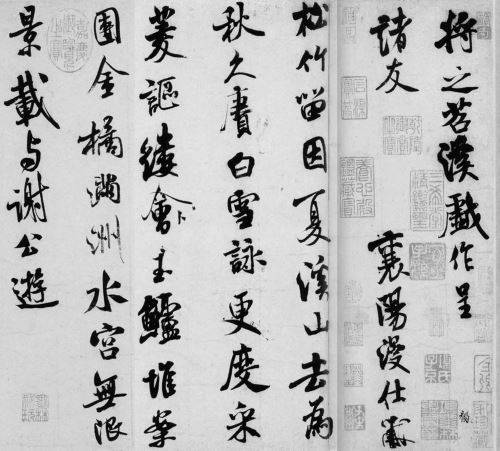 在章法上,《苕溪诗》师崇《兰亭序》,如出《兰亭序》一脉。各字各行之间向背,偃仰、肥瘦、急缓、浓淡似信笔挥来,却又是极费斟酌。没有炉火纯青的艺术造诣和心有灵犀一点通的艺术灵感是不可能创作出如此沉着超逸的长幅的。如第十行“半歲依倄竹三时看好”上二字若即若离,第三、四、五字顺承依赖关系渐趋紧密,“三时看”则近乎连在一起,“好”则与上面的两个字遥相呼应,情趣盎然,整行字呈外拓内敛之势。最值得一提的是第十七行的“友”,粗重、肥硕,如天外飞石,力发千钧,如《兰亭序》文末的“文”,是模仿,更是创造。