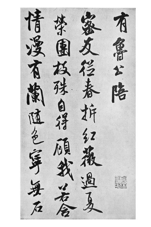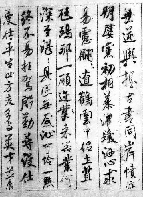 在结体上,《苕溪诗》改变了早期习欧内敛外张的结字,向宽松外拓发展,字体显得雍容大度,不紧不慢,有贵妇之态。如第二行的“友”,下半部尽情向左或向右下方舒展,如人早起伸个懒腰,舒筋活血,惬意之情不可言传。再如第二十六行的“鸿”、第二十七行的“缘”,第二十八行的“荆”等,都如“友”一样有异曲同工之妙。
