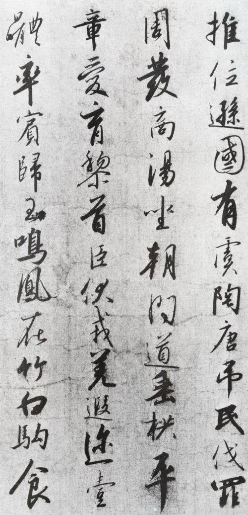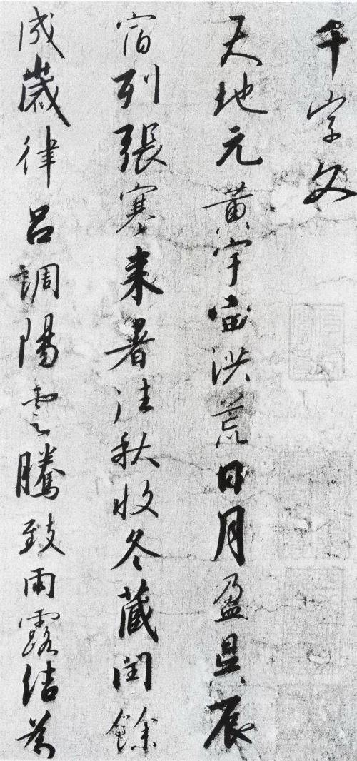 《千字文》在结体上,字体时大时小,因章法而异。长字瘦削,短字轻盈沉稳,体现了笔画搭配的严整和内在的力感。如“夫”,淡淡四笔,飘飘洒洒又有机结合,似出无意却在无意中表现出书家点画安排独到的理解。