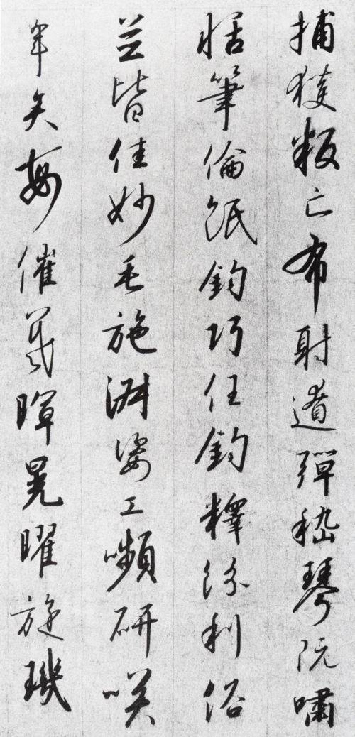 在章法上,《千字文》是疏放而严密,对比分明,相映成趣。行距的宽松和字距的紧密的对比,使得字与字之间的过渡气息通畅自然。两字之间绝无游丝或连笔,字体长短、粗细、轻重的对比恰到好处,整个书作显得飘逸,气韵生动,神意相连。特别是全篇隔一差二地安排偏肥浓重的字体,起到了稳定全篇、控制飘忽摇摆的奇效。