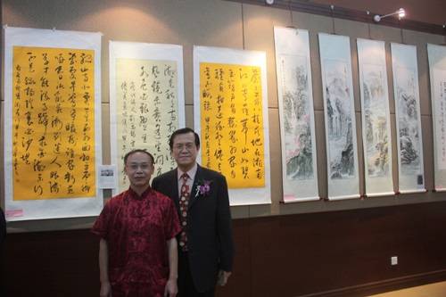 图 2于工在其作品前与马来西亚前交通部长、马来西亚民族中兴基金会总执行长丹斯里翁诗杰(右)留影。