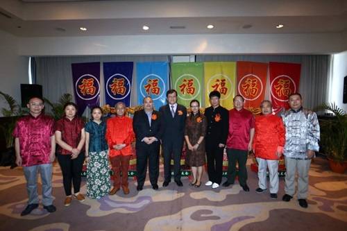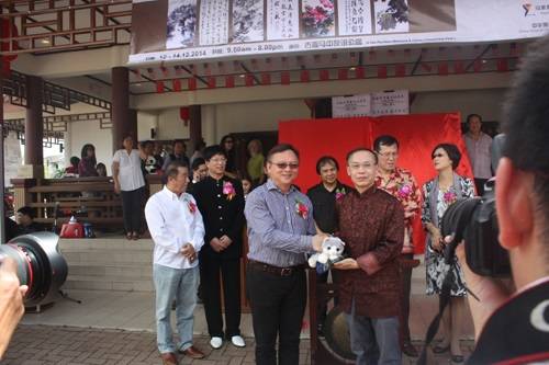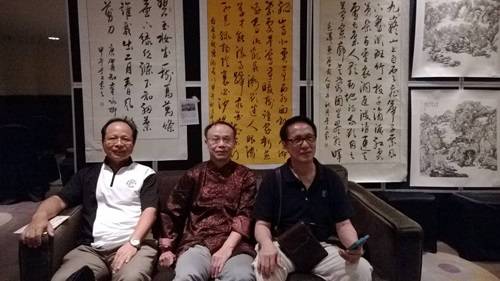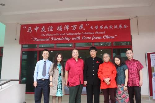 图3在吉隆坡书画展开幕式上,右五为中国驻马来西亚大使馆代办马伽、右六为活动主办者马来西亚民族中兴基金会总执行长丹斯里翁诗杰。