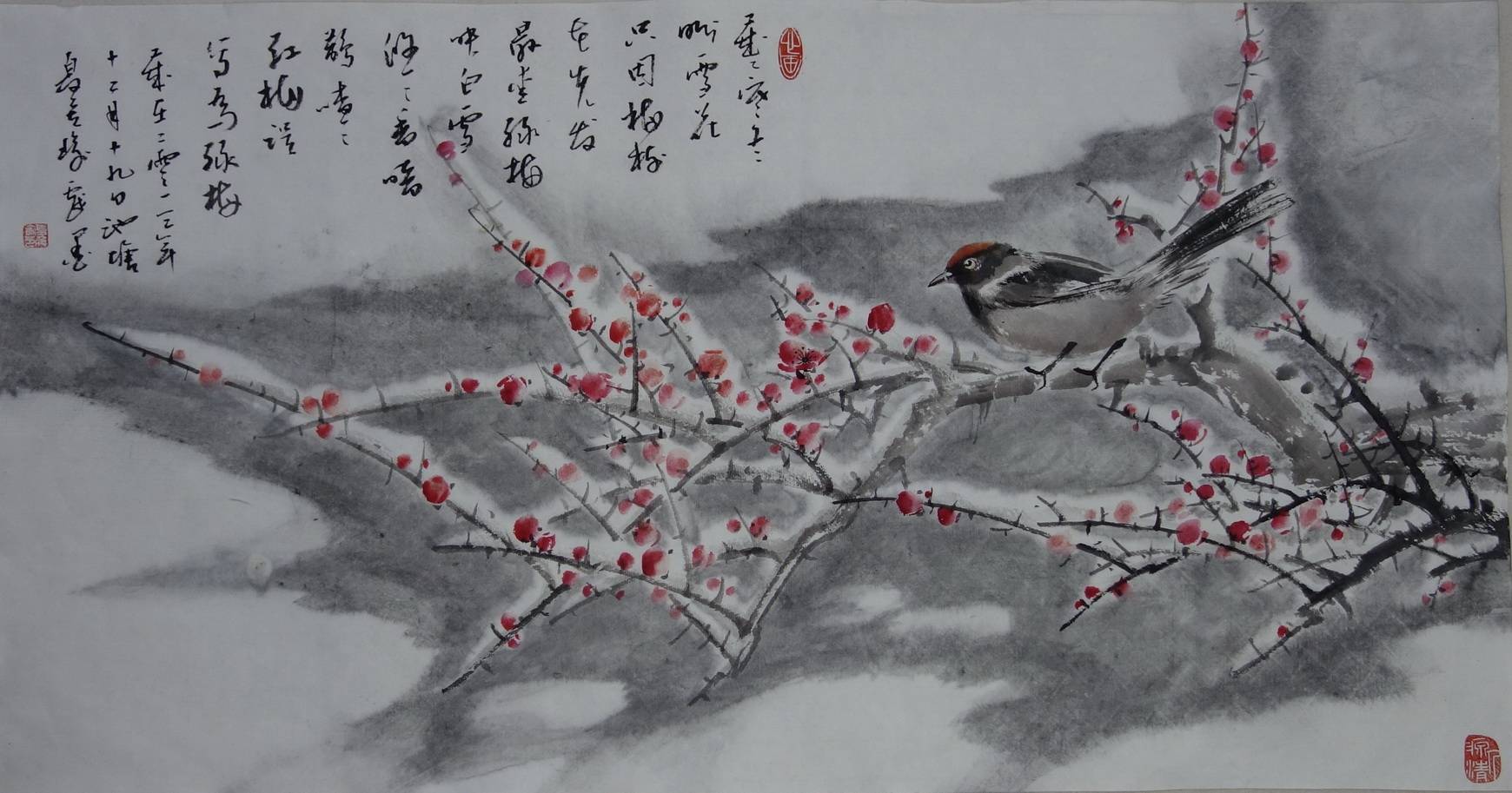 最爱红梅映白雪,悠悠香暗鹊喳喳。