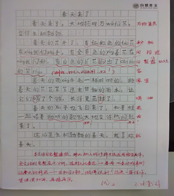 这是我校边家村校区一年级作文学员张泽睿同学的课堂限时作文,该学生是去年参加我校“作文免费学”活动学习体验后报名的学生。本篇作文是小张同学本学年春季开课的第一次习作,老师对于文中的句子只是在课堂上讲解要点——如何将句子写具体时有所引导和学生口头作文有所指导,而在限时作文中能做到书写规范整齐,作文结构完整,层次设计分明,选材布局恰到好处,着实对于一位一年级的学生来说是难能可贵的表现。文中某些汉字不会写也是情有可原的哦……还有,我要悄悄地告诉大家:这是我修改作文以来第一次没有改动原文中的词语和句子,您明白我的意思了吗?