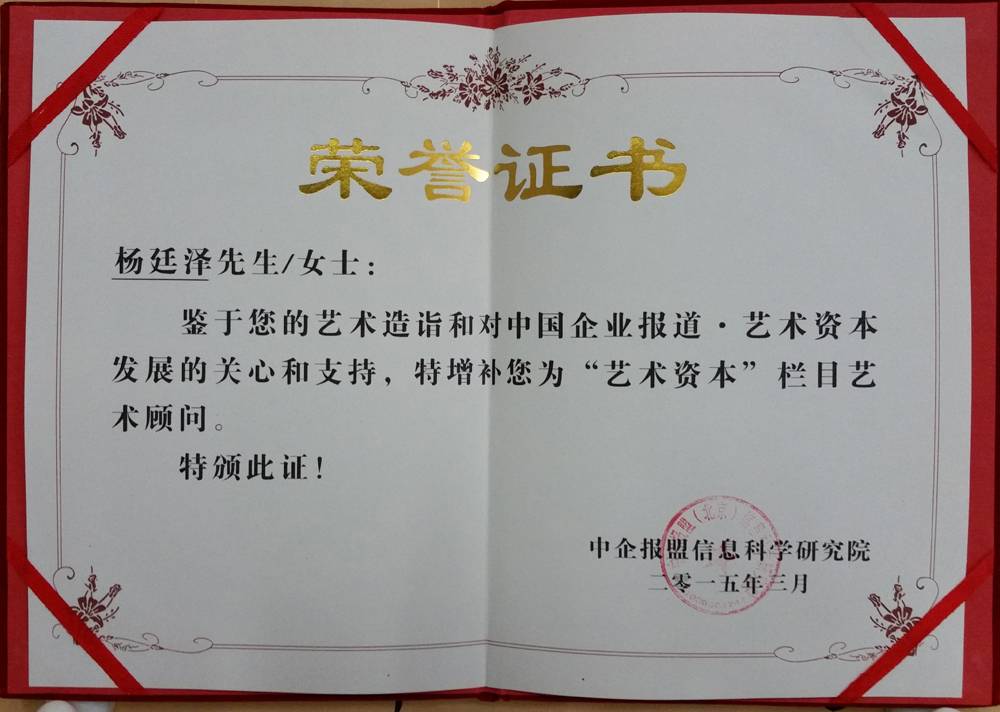 2015年3月杨廷泽被聘为中国企业报道艺术资本顾问,担任顾问的还有欧阳中石、刘大为、冯远、范曾、张海、李铎、沈鹏、王琦、杨晓阳、靳尚谊、孙其峰、史国良、权希军。
