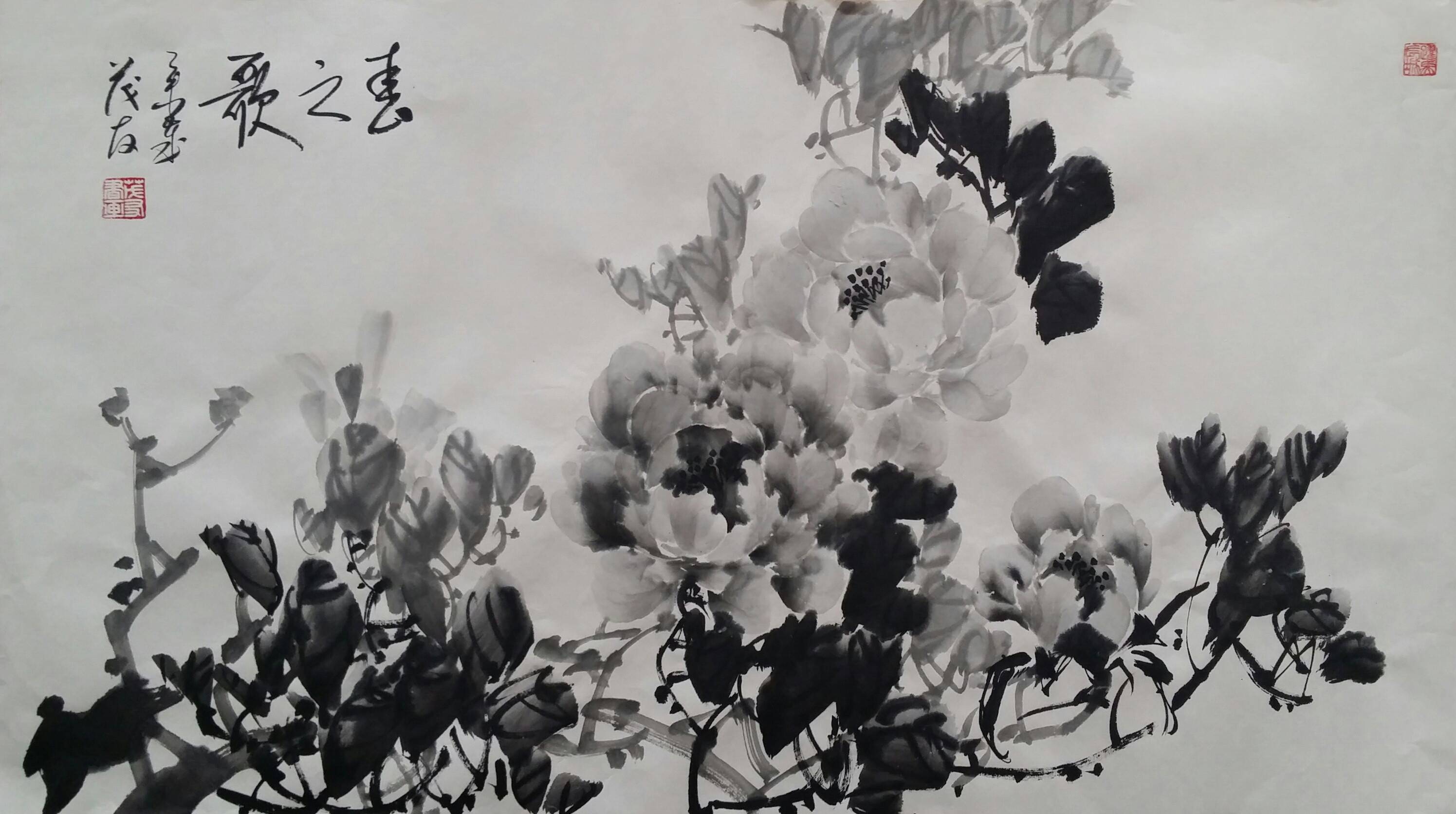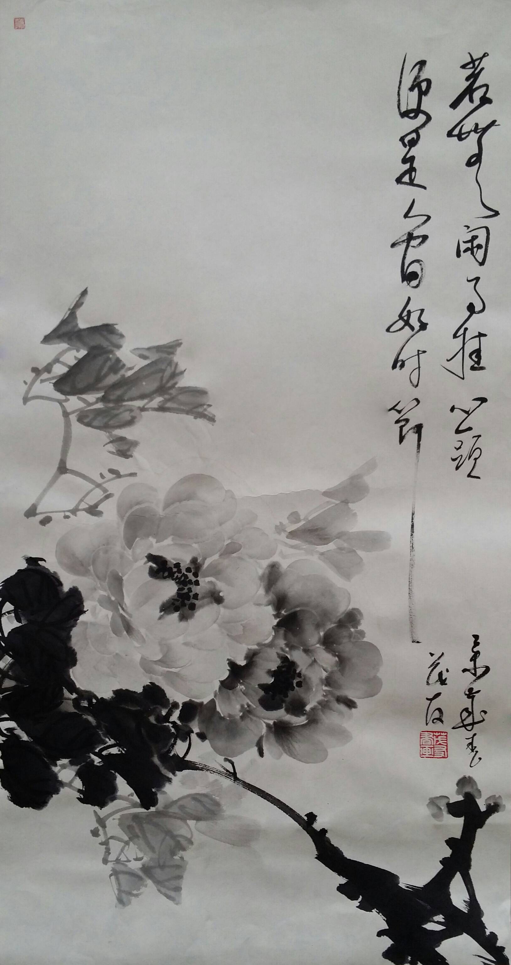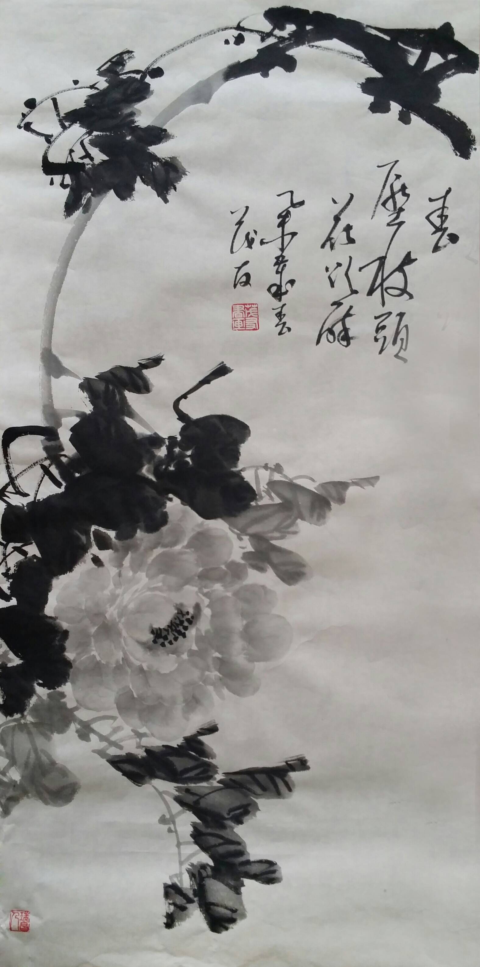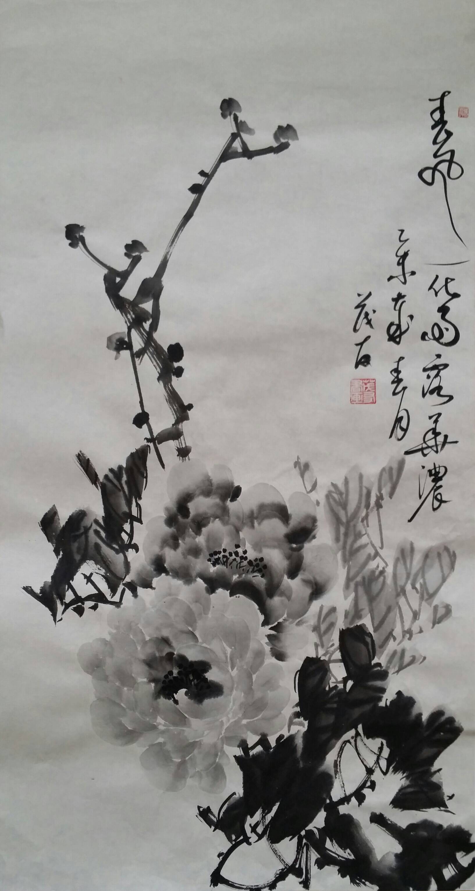 古往今来,牡丹就以其独有的风韵在众香国里风华绝代独领风骚,吸引着无数的画家为其倾尽翰墨洒尽丹青。纵观中国画史,善画水墨牡丹的画家不多,我们可以追溯到明代徐渭首创的泼墨法画牡丹,他以水墨写意牡丹,泼辣豪放,笔墨洗练,独具特色。之后有沈周、唐寅、陈淳等,所画水墨牡丹,别具特色、独成一格。到了清代有吴昌硕、任伯年、恽寿平、高凤翰、虚谷、蒋廷锡等人,所作水墨牡丹颇有格调。尔后近代,齐白石的作品中尤以牡丹为多,所作牡丹大笔重点,写意豪宕,动姿飞扬,墨笔撇飞。再有张大千、李苦禅、谢稚柳、刘海粟、王雪涛、黄胄等都曾画很多水墨牡丹,他们各有风格,或设色清雅,或浓淡相宜,或线条圆润。他们都为后来的牡丹画家留下了弥足珍贵的范本。