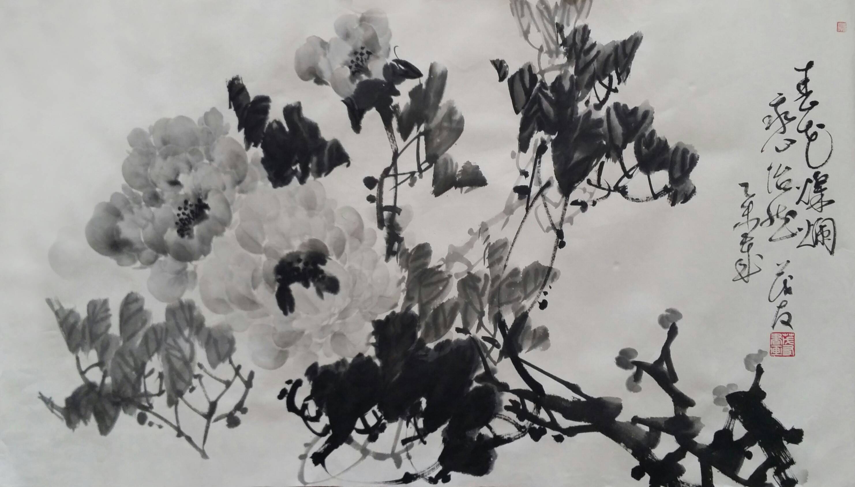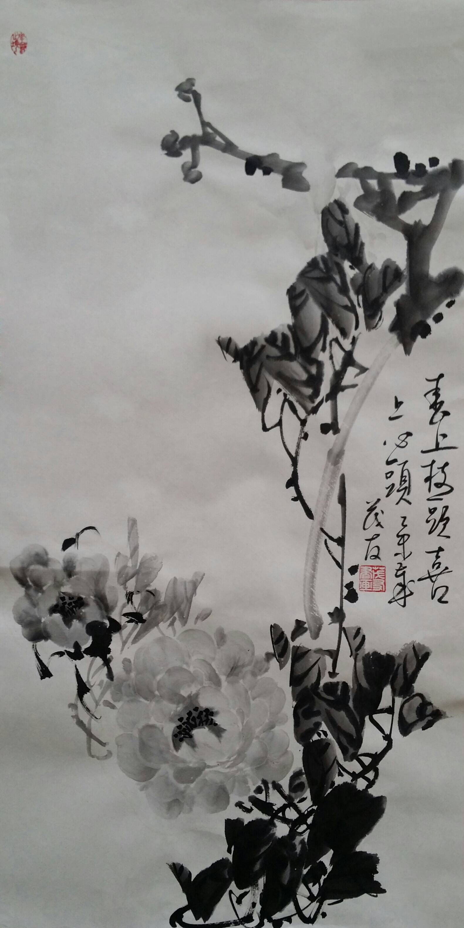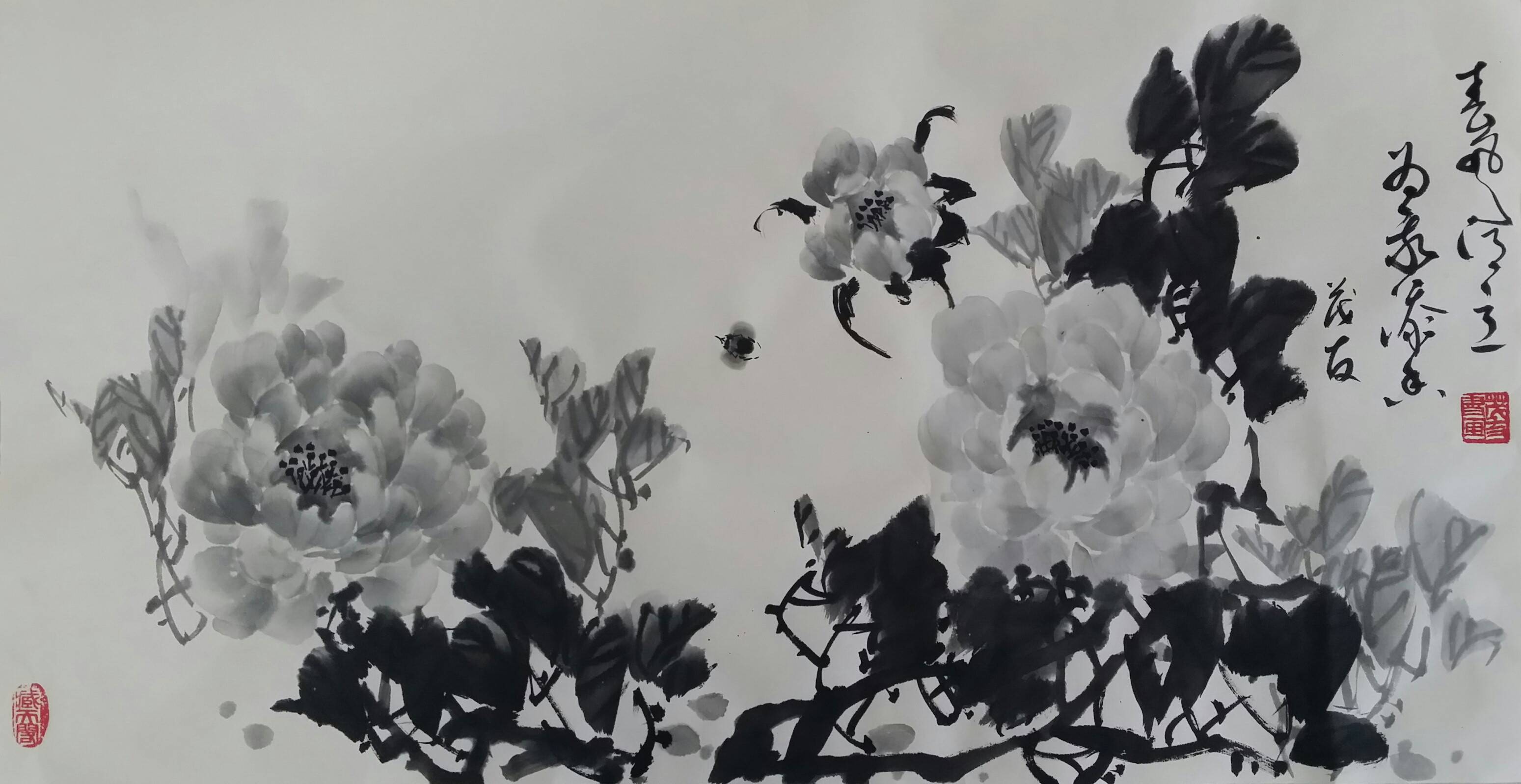 古往今来,牡丹就以其独有的风韵在众香国里风华绝代独领风骚,吸引着无数的画家为其倾尽翰墨洒尽丹青。纵观中国画史,善画水墨牡丹的画家不多,我们可以追溯到明代徐渭首创的泼墨法画牡丹,他以水墨写意牡丹,泼辣豪放,笔墨洗练,独具特色。之后有沈周、唐寅、陈淳等,所画水墨牡丹,别具特色、独成一格。到了清代有吴昌硕、任伯年、恽寿平、高凤翰、虚谷、蒋廷锡等人,所作水墨牡丹颇有格调。尔后近代,齐白石的作品中尤以牡丹为多,所作牡丹大笔重点,写意豪宕,动姿飞扬,墨笔撇飞。再有张大千、李苦禅、谢稚柳、刘海粟、王雪涛、黄胄等都曾画很多水墨牡丹,他们各有风格,或设色清雅,或浓淡相宜,或线条圆润。他们都为后来的牡丹画家留下了弥足珍贵的范本。