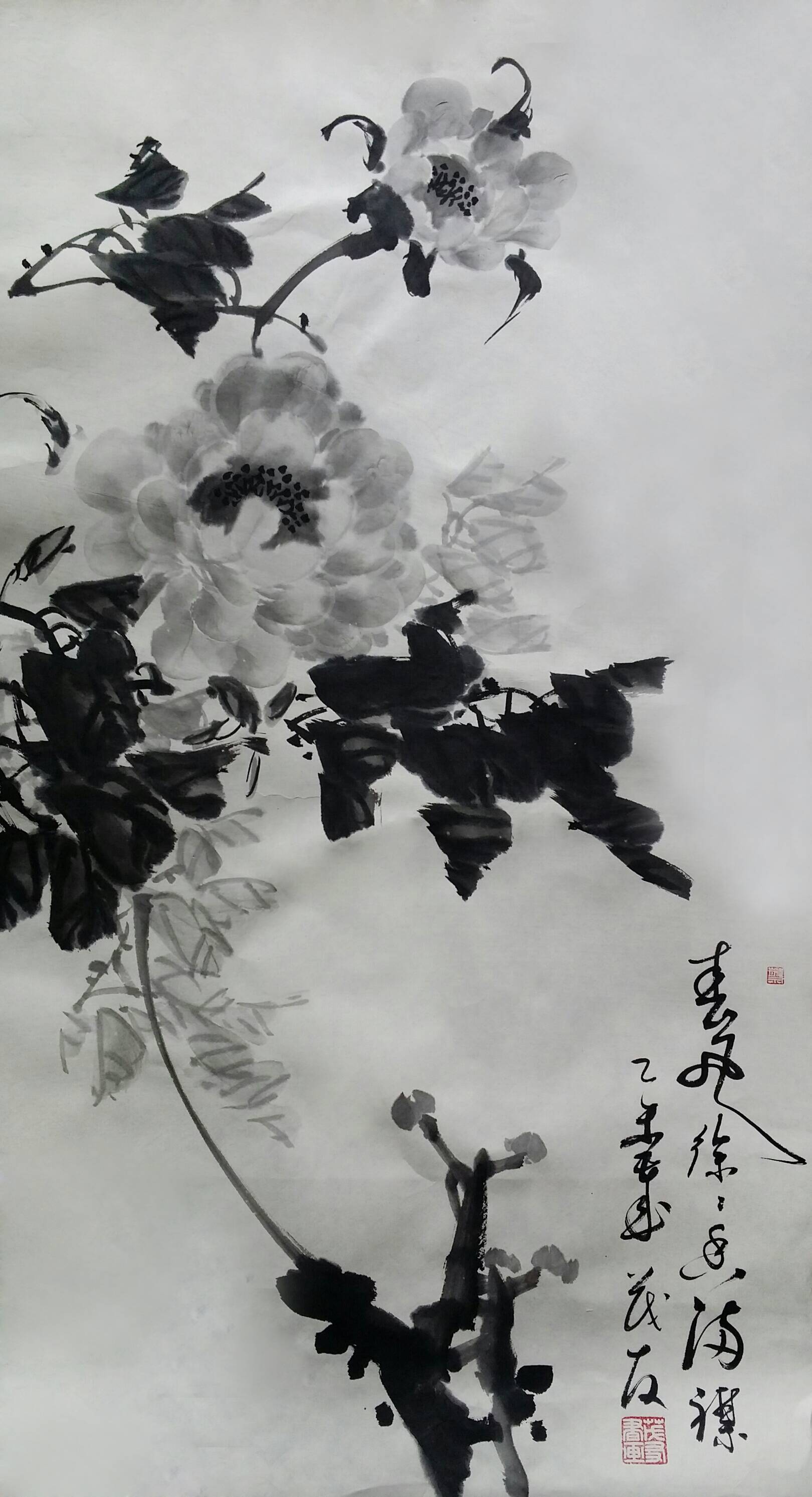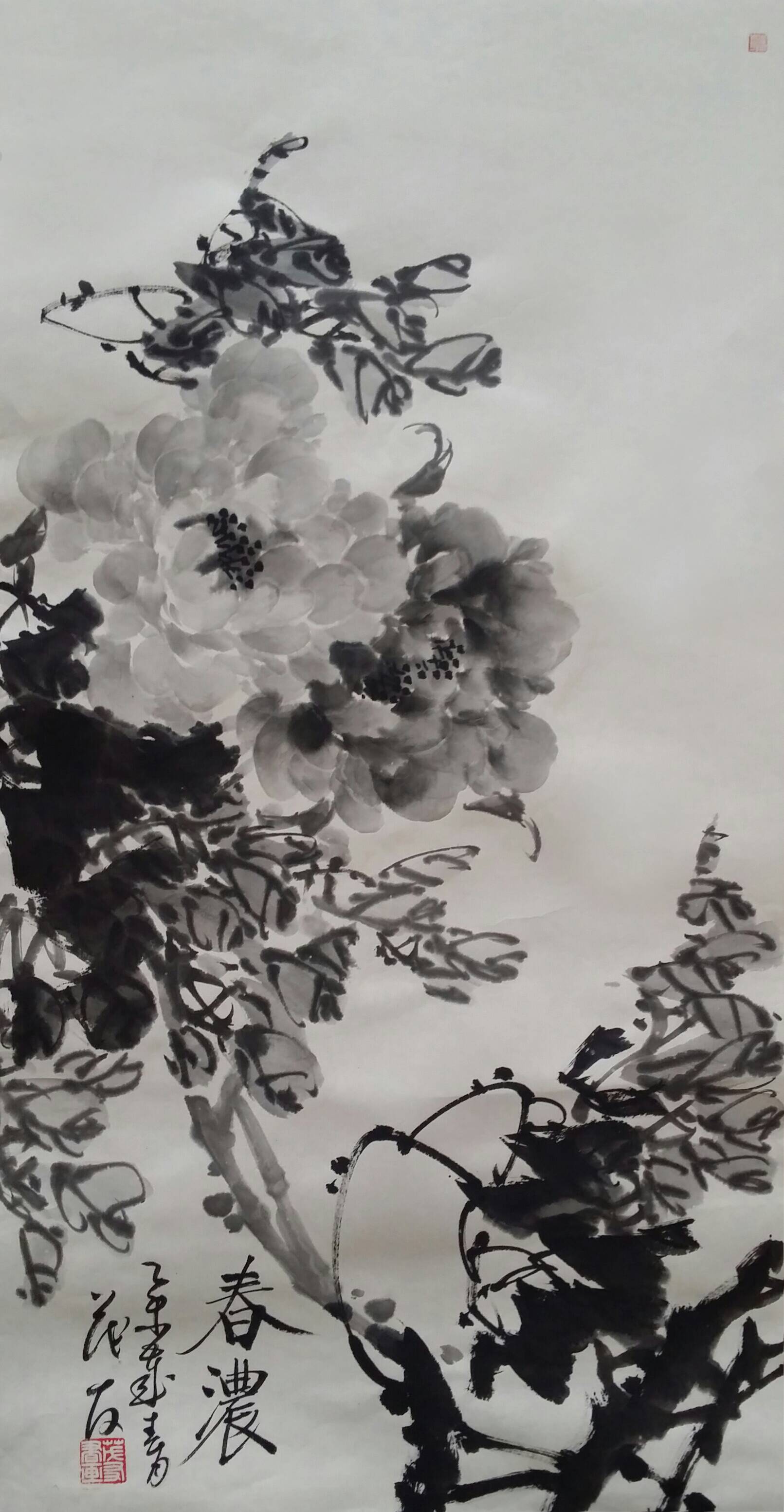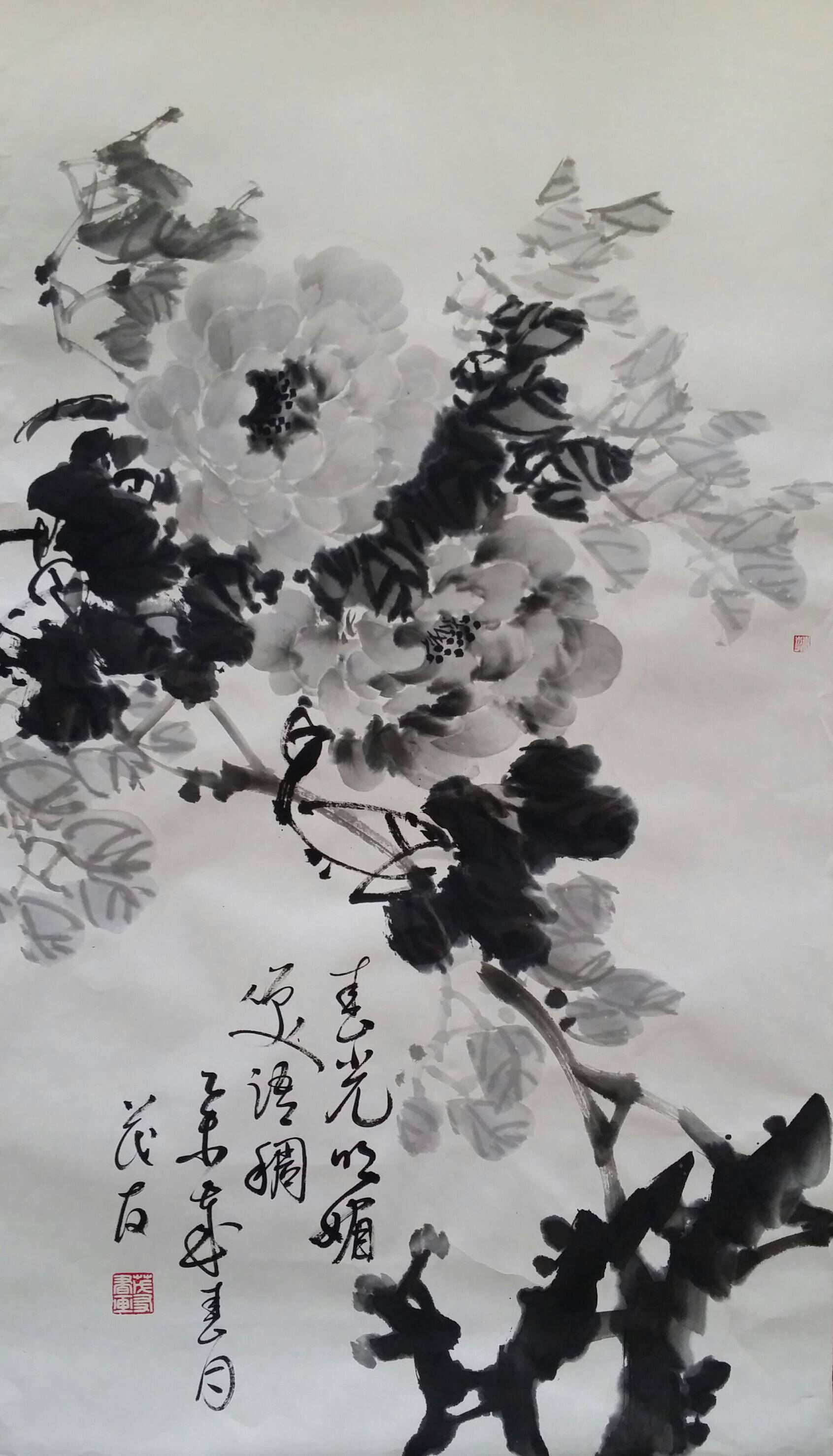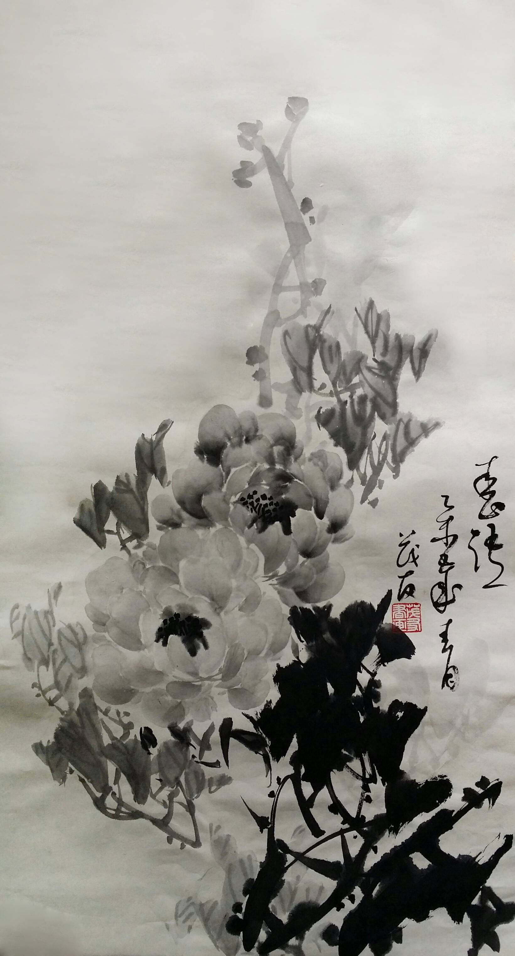 古往今来,牡丹就以其独有的风韵在众香国里风华绝代独领风骚,吸引着无数的画家为其倾尽翰墨洒尽丹青。纵观中国画史,善画水墨牡丹的画家不多,我们可以追溯到明代徐渭首创的泼墨法画牡丹,他以水墨写意牡丹,泼辣豪放,笔墨洗练,独具特色。之后有沈周、唐寅、陈淳等,所画水墨牡丹,别具特色、独成一格。到了清代有吴昌硕、任伯年、恽寿平、高凤翰、虚谷、蒋廷锡等人,所作水墨牡丹颇有格调。尔后近代,齐白石的作品中尤以牡丹为多,所作牡丹大笔重点,写意豪宕,动姿飞扬,墨笔撇飞。再有张大千、李苦禅、谢稚柳、刘海粟、王雪涛、黄胄等都曾画很多水墨牡丹,他们各有风格,或设色清雅,或浓淡相宜,或线条圆润。他们都为后来的牡丹画家留下了弥足珍贵的范本。
