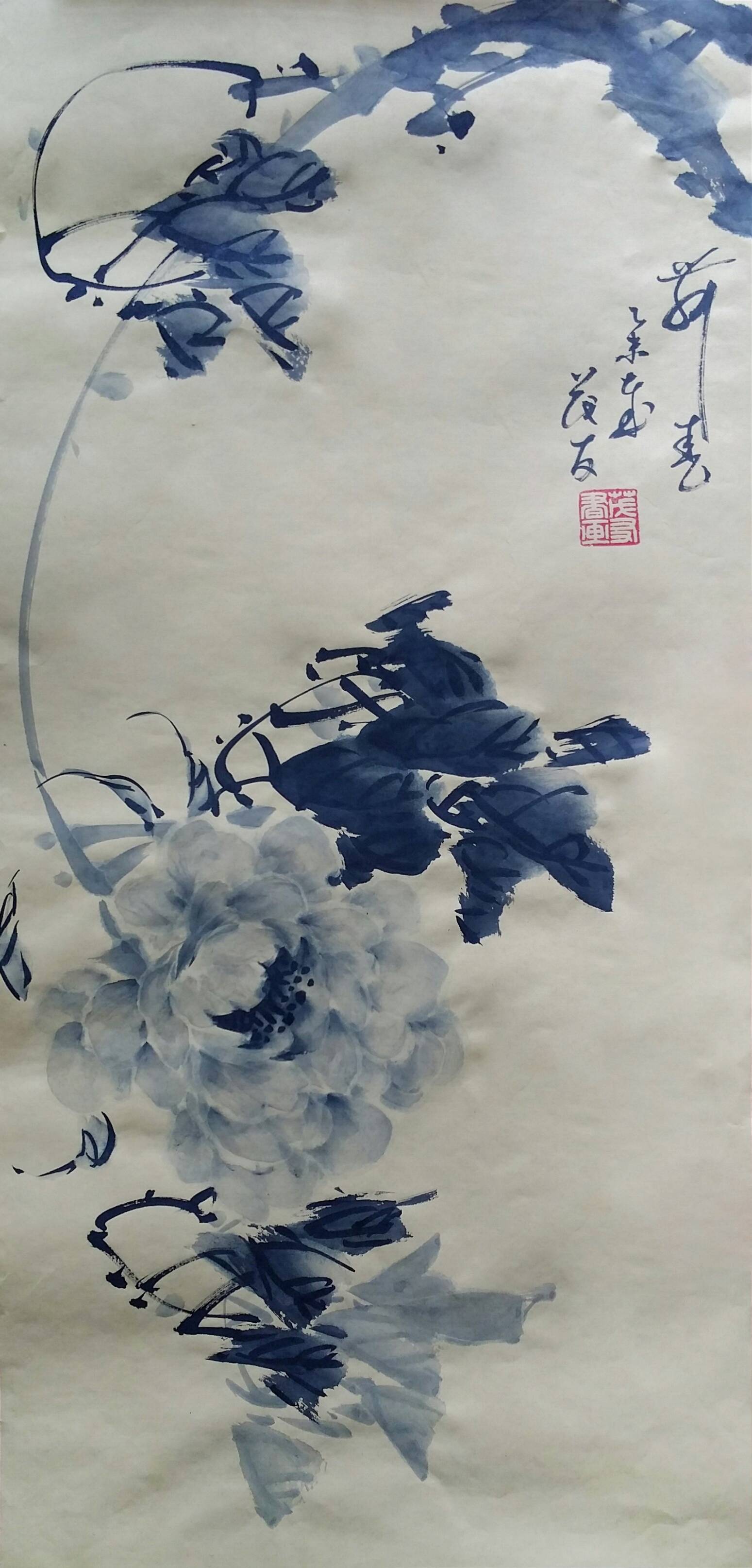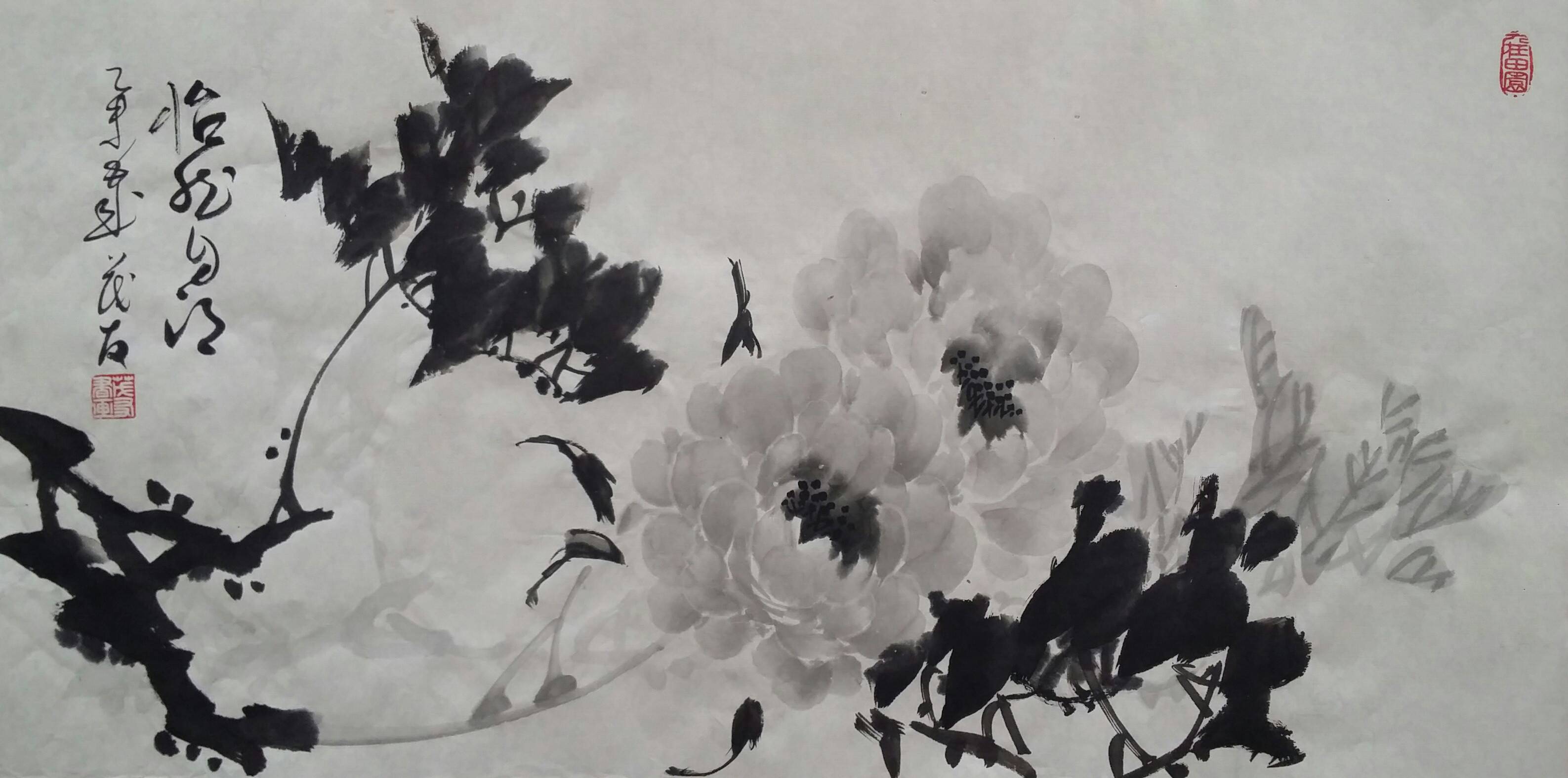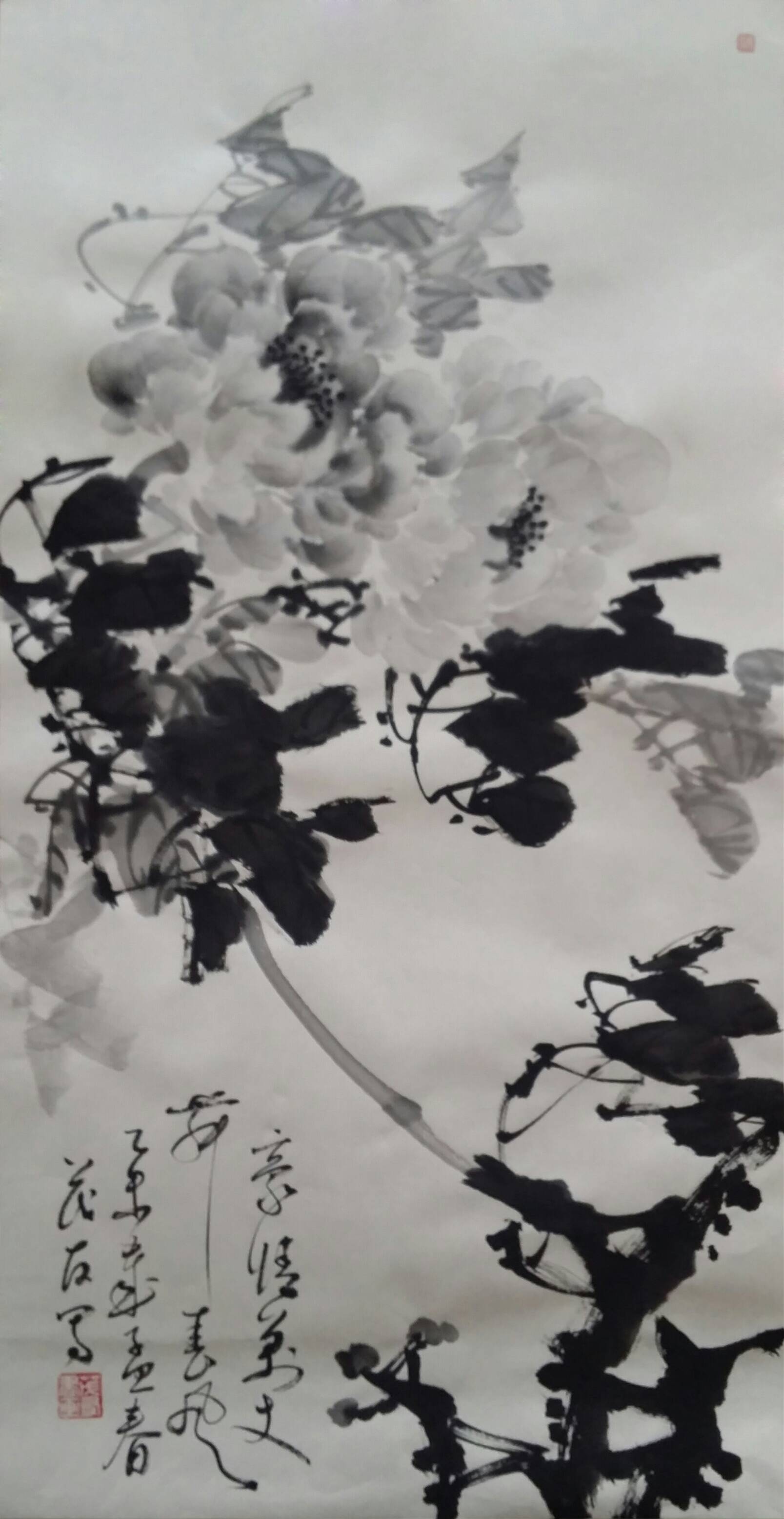 古往今来,牡丹就以其独有的风韵在众香国里风华绝代独领风骚,吸引着无数的画家为其倾尽翰墨洒尽丹青。纵观中国画史,善画水墨牡丹的画家不多,我们可以追溯到明代徐渭首创的泼墨法画牡丹,他以水墨写意牡丹,泼辣豪放,笔墨洗练,独具特色。之后有沈周、唐寅、陈淳等,所画水墨牡丹,别具特色、独成一格。到了清代有吴昌硕、任伯年、恽寿平、高凤翰、虚谷、蒋廷锡等人,所作水墨牡丹颇有格调。尔后近代,齐白石的作品中尤以牡丹为多,所作牡丹大笔重点,写意豪宕,动姿飞扬,墨笔撇飞。再有张大千、李苦禅、谢稚柳、刘海粟、王雪涛、黄胄等都曾画很多水墨牡丹,他们各有风格,或设色清雅,或浓淡相宜,或线条圆润。他们都为后来的牡丹画家留下了弥足珍贵的范本。