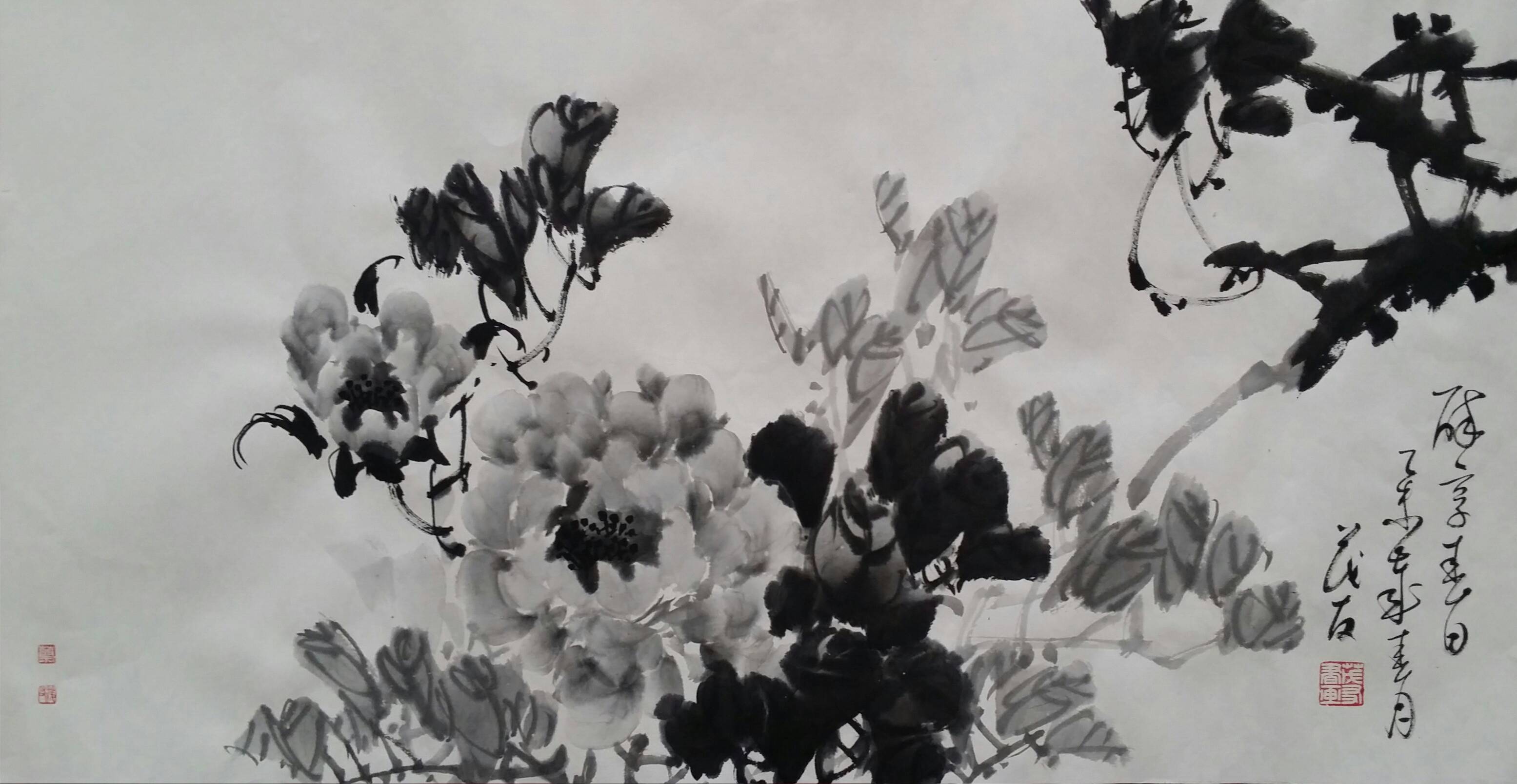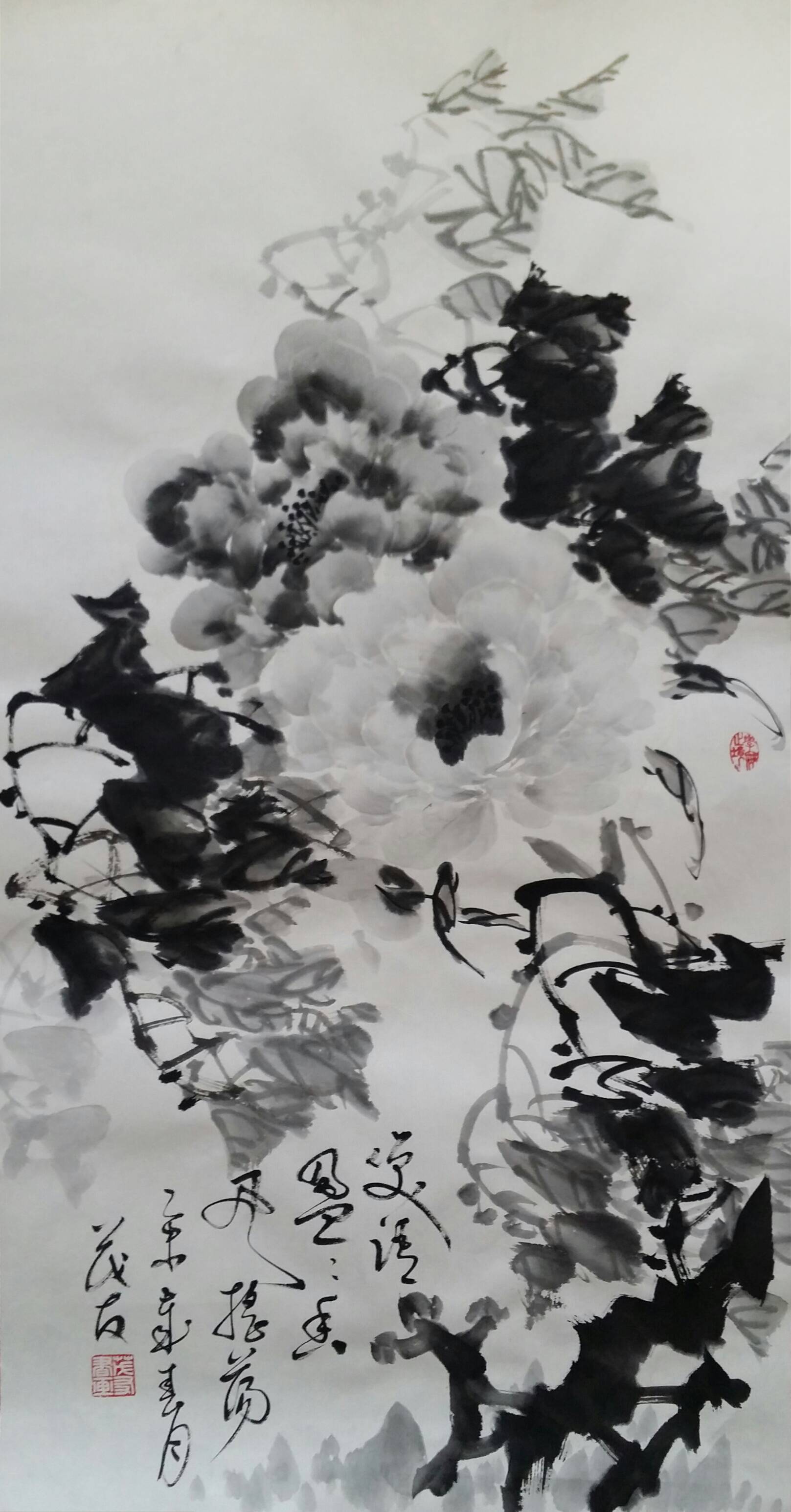 众所周知,创作水墨牡丹不易,雅难求,以致画史上能数得上的画家甚少。通常在画水墨牡丹的过程中遇到诸多问题:如用水墨润染的花瓣间不均匀而导致透明度较低以及整朵花的结构空间关系不突显,或花与花之间的用笔雷同,或水分与墨难以控制导致整个花瓣难以成形,或花朵与枝杆墨色的关系浑杂不清等问题而败笔,其创作难度很大。论及当今大写意水墨牡丹,当代名家蔡茂友苦研的水墨牡丹画,从墨分五色到墨分千层,主要是立体感,明暗变化。水润冰心,主要是牡丹的质感,水色鲜嫩欲滴,更有一种情绪,一种愉悦感,一种积极向上的情绪。值得一提的是他以书法最高境界——草书入画水墨牡丹,其草法入画,涉笔潇洒,神韵隽雅。在墨花横溢中但见花瓣叠络,层感立透。再配以草书题跋,云烟满纸而不失浓厚的书卷气,确为当代画坛为数不多的水墨牡丹画名家。