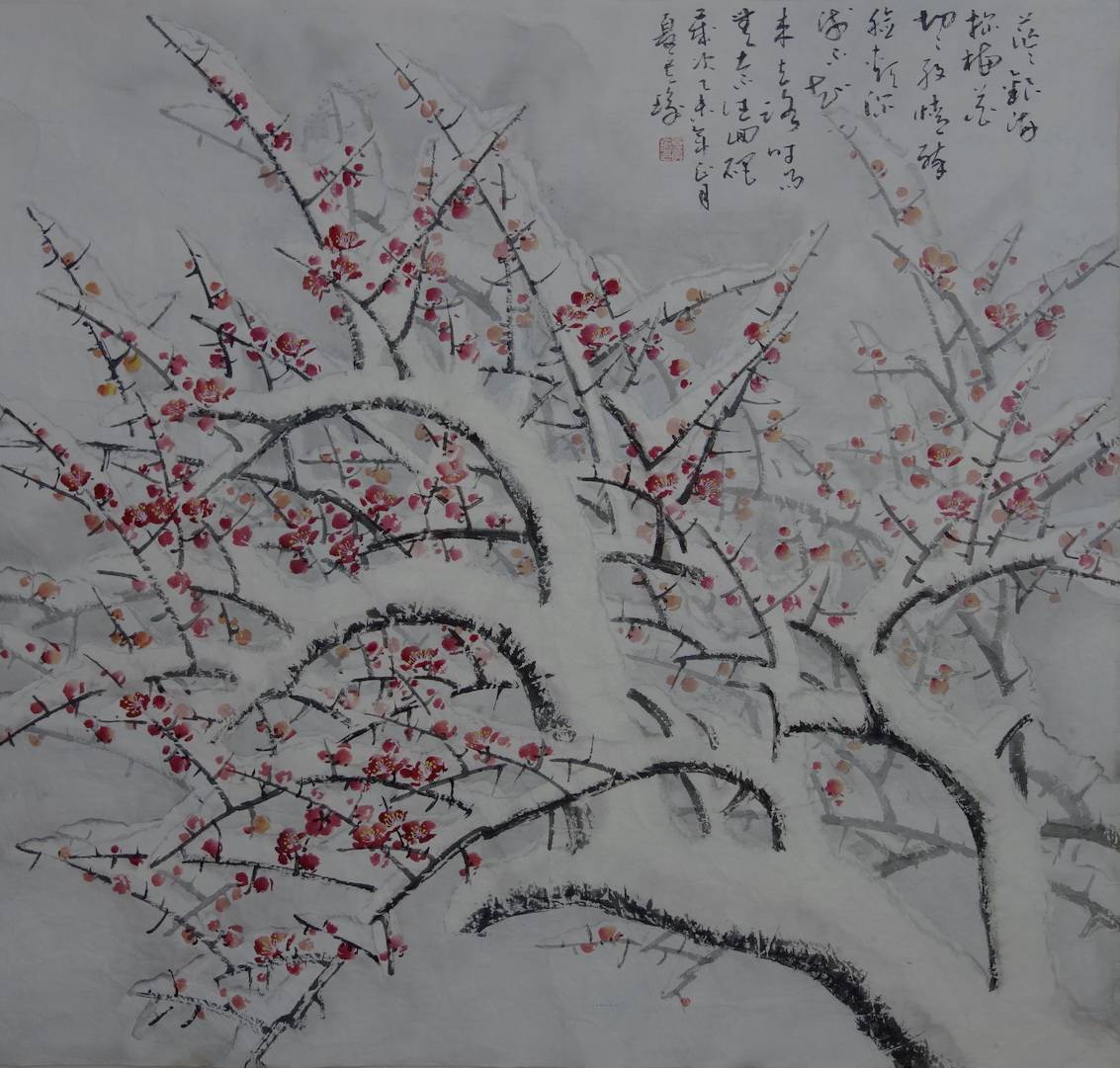 茫茫雪海探梅花,切切殷情醉脸颊。
