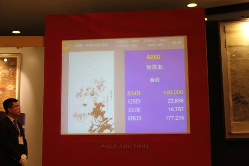 北京保利第30期精品拍卖会于4月25日上午在北京亚洲大酒店圆满落下帷幕。当代书画名家蔡茂友的水墨牡丹作品《春语》首次亮相北京保利精品拍卖会,经过多轮激烈竟拍,最终以14万元落槌,总成交价16.1万元,(作品尺幅为3.5平方尺)平均每平方尺4.6万元,创下2015年首拍画家个人作品的价格新高。