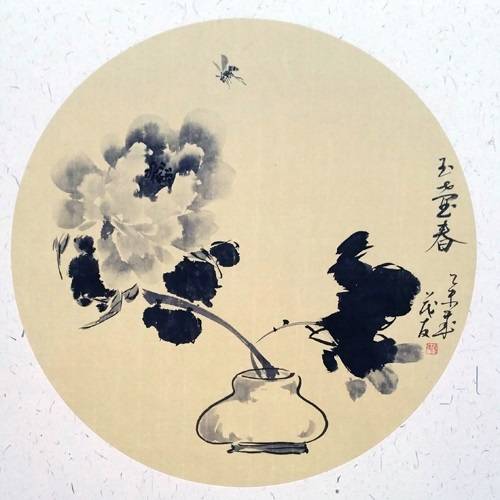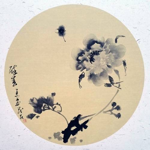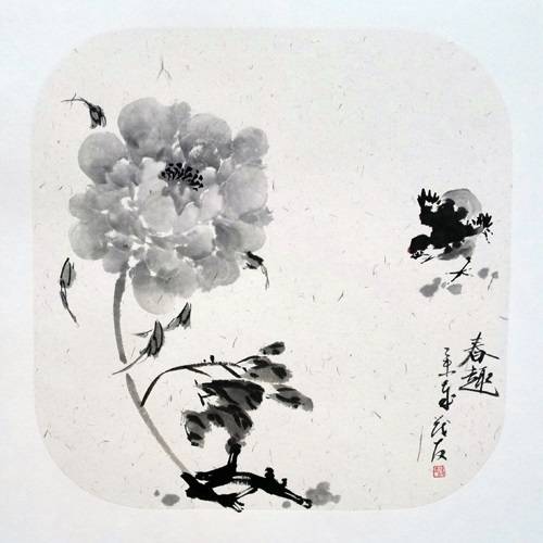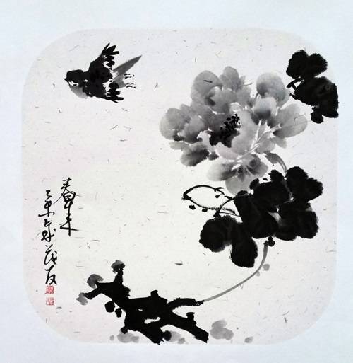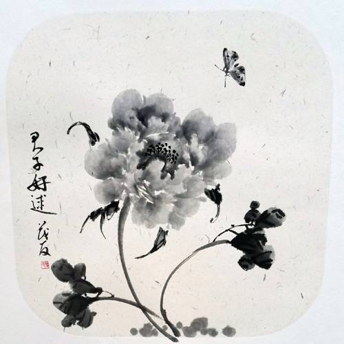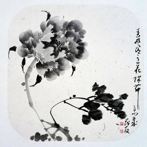 观赏蔡茂友的水墨牡丹画小品,画面寥寥几笔,却显得洒脱自然。单从画面笔墨来看,技法娴熟,用笔线条灵动自如,如同戏曲中优雅的举态,画面层次分明,虚实相生,生动无比。再观花瓣,巧用水染墨色之间产生出花的层次,花瓣细处时而以淡墨勾染,时而花蕊点以浓墨,而围绕花蕊的几片叶子则以浓墨,显得很厚重,形成花色轻淡、花瓣轻而薄,花叶晶莹剔透,墨分千层的格调,足见蔡茂友水墨牡丹之功力。