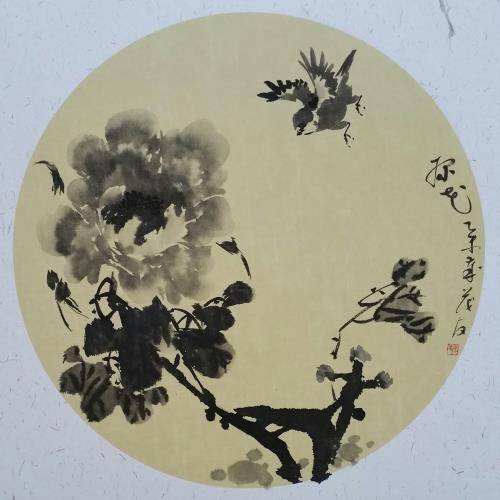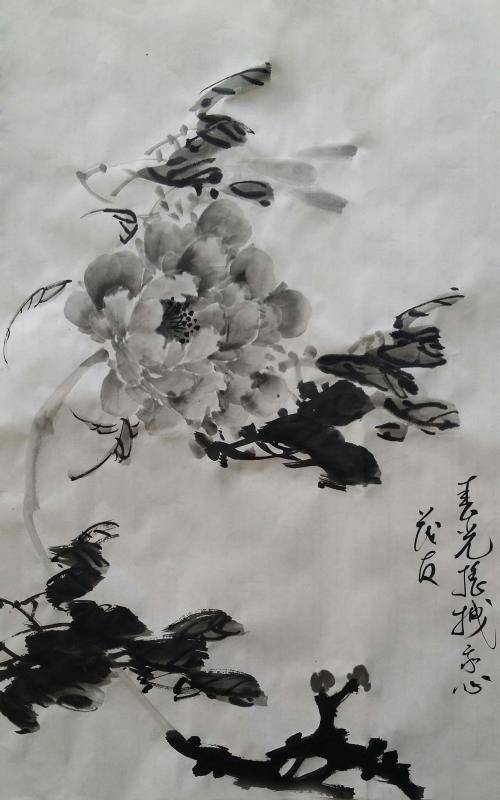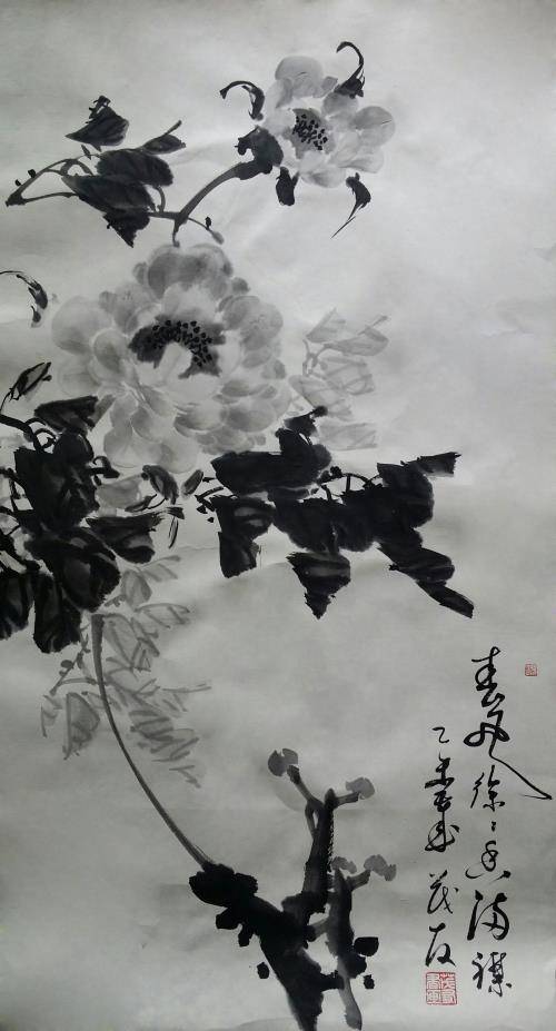 蔡茂友在水墨牡丹探索创作中取得新的突破口:他掌控毛笔在极为合适比例的墨汁和清水中渲染成色,画时略一沾带,灵活运笔,一株墨色清雅的牡丹跃然纸上。通过奇妙地利用水墨与宣纸的特性,蔡茂友笔下的牡丹花瓣和叶子有了独一无二的质感。精心布局,以水墨的浓淡描绘花的层次变化,墨即是色色即是墨,力求墨分五彩到墨分千层的艺术格调。
