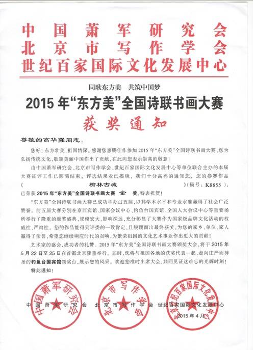 高华强在2015年“东方美”全国诗联书画大赛中获金