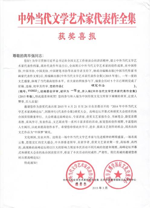 高华强中外当代文学艺术家代表作全集获奖喜报照片