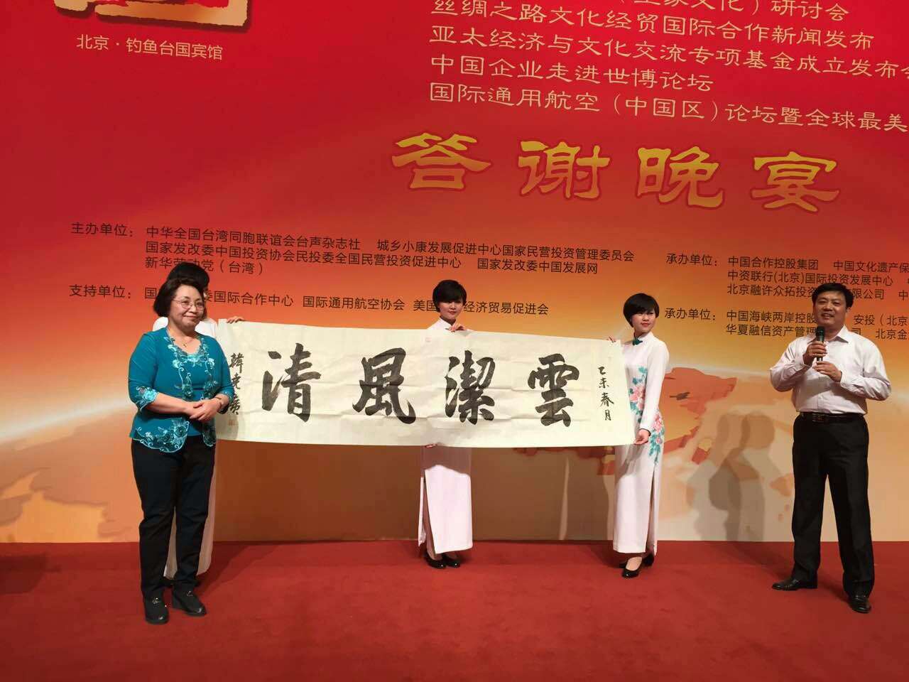 在钓鱼台国宾馆,向台湾新华劳动党主席韩云洁赠送书法