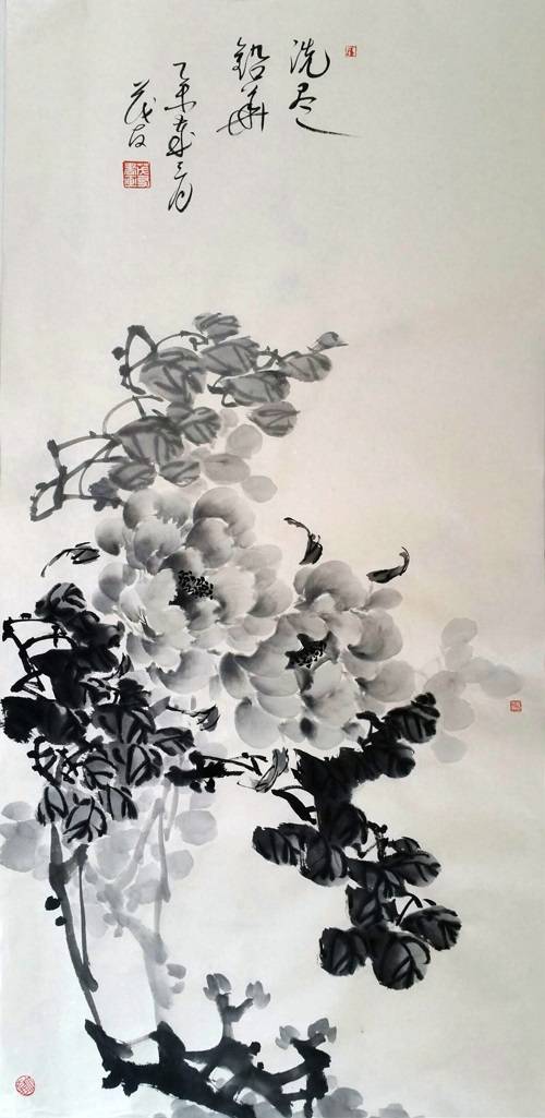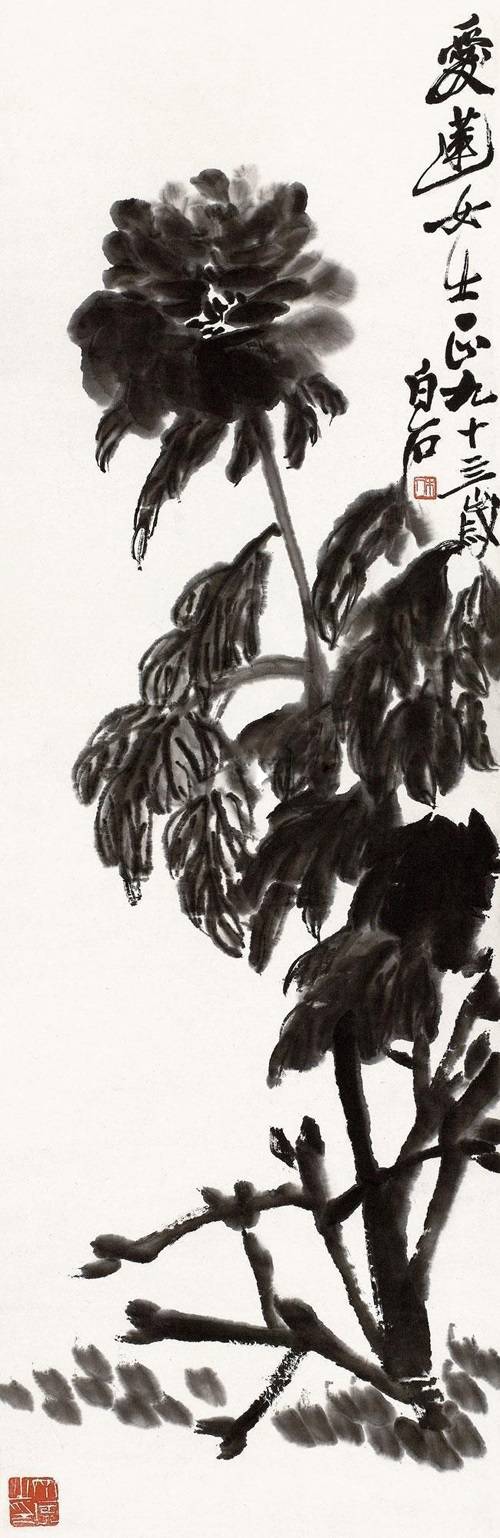 齐白石,(1864 —1957),原名齐纯芝,号渭清,祖父取号兰亭,老师取名齐璜,号濒生,别号寄萍老人、白石山人,后人常将“山人”二字略去,故后常号“白石”。齐白石是近代中国著名的国画画家,十九至二十世纪中国画艺术大师,早年曾为木工,后以卖画为生,擅长画花鸟、虫鱼、山水、人物,衰年变法,笔墨雄浑滋润,色彩浓艳明快,造型简练生动,所作鱼虾虫蟹,天趣横生。其书工篆隶,取法秦汉碑版,行书饶古拙之趣,篆刻自成一家,亦能诗文。与张大千并称“南张北齐”。齐白石所作水墨牡丹不多,但有自己独特的艺术风格。他的水墨牡丹画,花叶丰满,浑然一体,笔墨凝练,高度概括,墨色明朗清新,达到了形神兼备、情景交融的境界。