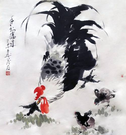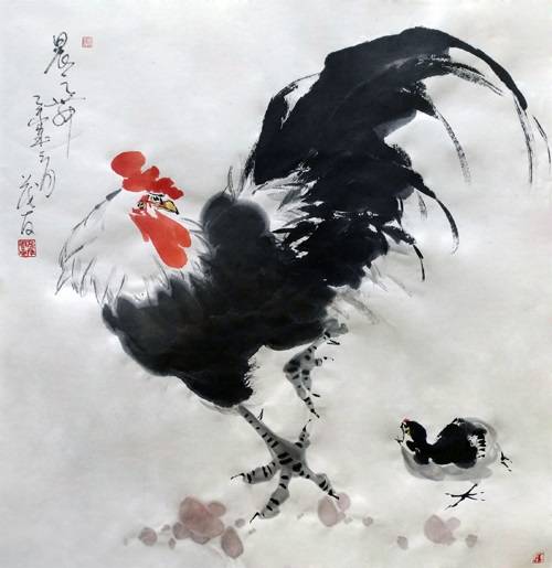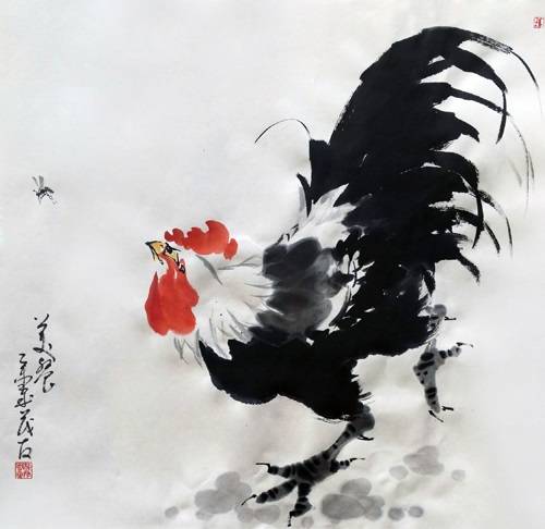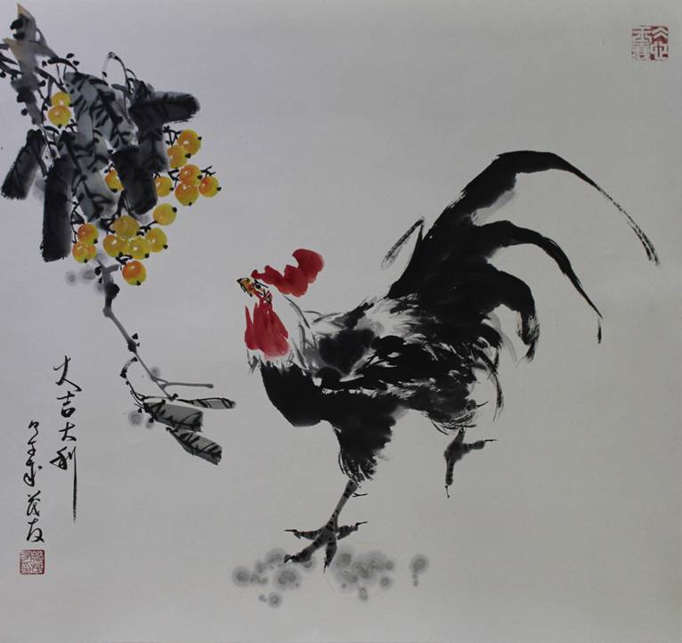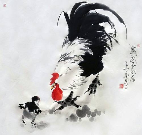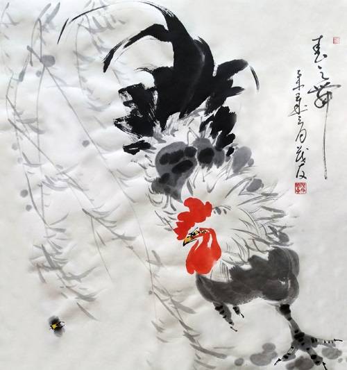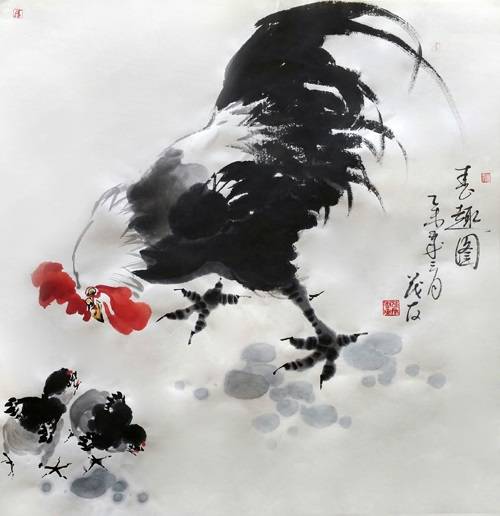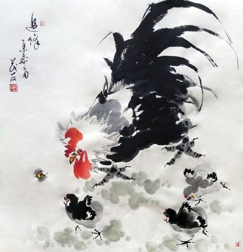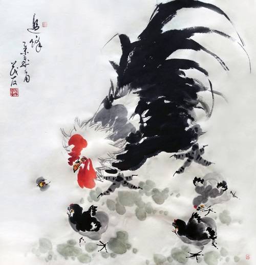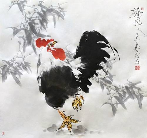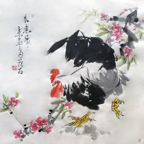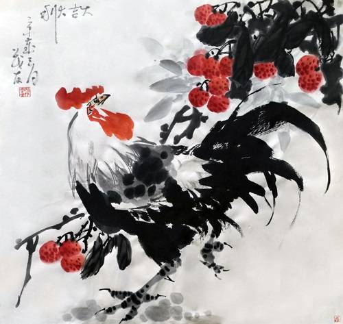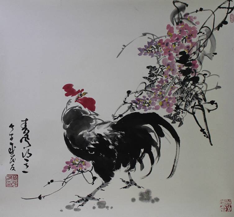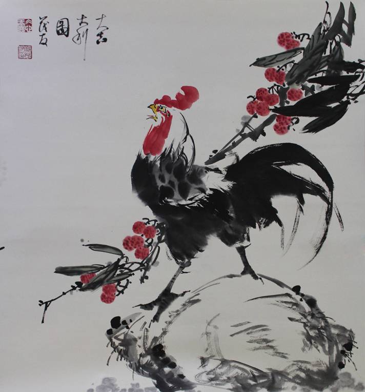 蔡茂友的花鸟水墨画特点是以草书入画,用笔轻重疾徐、顿挫转折极富节奏变化,他的书法长期攻研怀素、张旭、王铎等名家书风,在作品中既见传统,又见性格,书画合璧成趣。欣赏蔡茂友笔下的雄鸡系列作品,中锋草意入笔、侧锋辅之,用笔轻徐疾涩,墨色染泼相兼,极富浓、淡、干、湿等墨色变化,设色稳重中又有绚烂。他强化了笔墨的表现力,尤其善于运用浓墨浓彩,形成墨彩相撞相融的强烈效果,充满着视觉张力。从这系列作品中我们可以清楚地看出蔡茂友水墨雄鸡的艺术特色:其所作公鸡有雄健、朴拙之趣。在层次井然的红梅簇拥之下,一只雄鸡正昂首阔步,英姿勃发,神采奕奕;所作母鸡领着小鸡,迎着春风,笑语盈盈,乐趣无穷;所作幼鸡嬉戏,左顾右盼,描画活泼,以淡墨晕染,童趣十足,使人欣赏中有振奋愉悦之感。