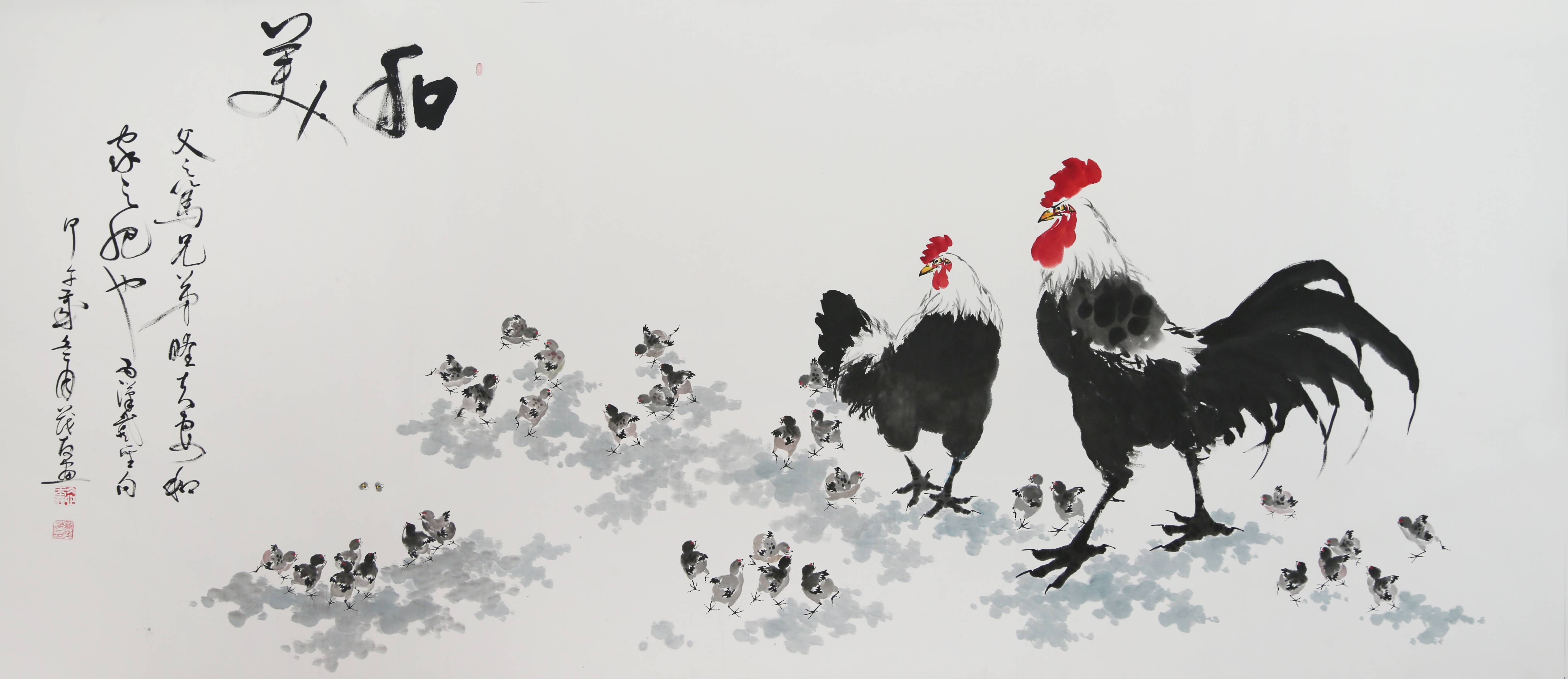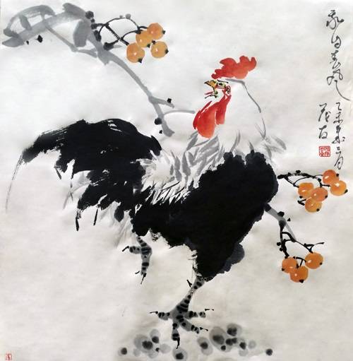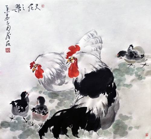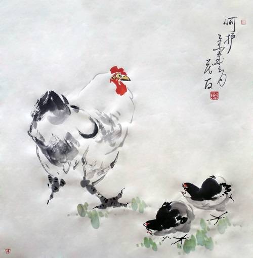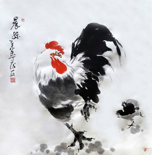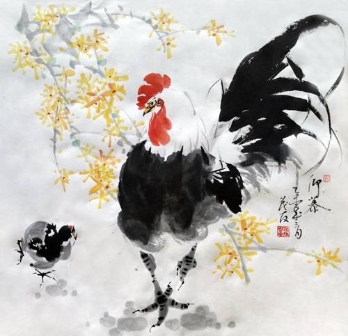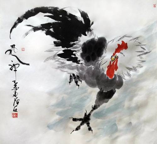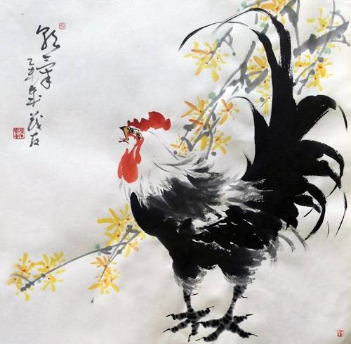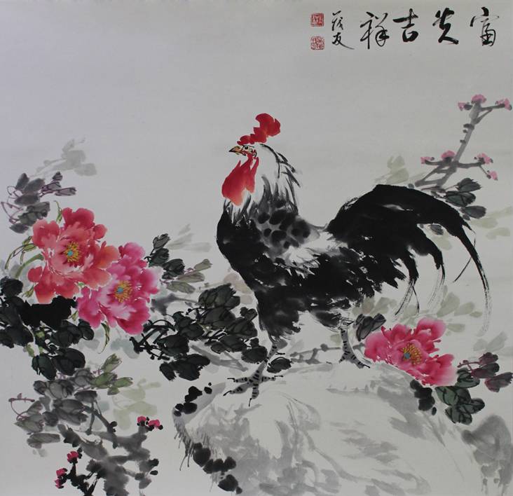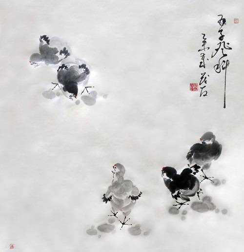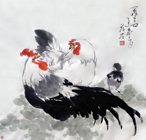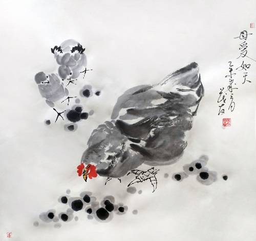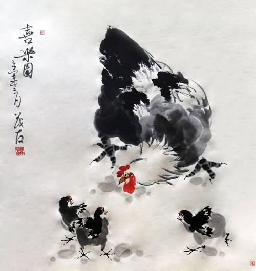蔡茂友的花鸟水墨画特点是以草书入画,用笔轻重疾徐、顿挫转折极富节奏变化,他的书法长期攻研怀素、张旭、王铎等名家书风,在作品中既见传统,又见性格,书画合璧成趣。欣赏蔡茂友笔下的雄鸡系列作品,中锋草意入笔、侧锋辅之,用笔轻徐疾涩,墨色染泼相兼,极富浓、淡、干、湿等墨色变化,设色稳重中又有绚烂。他强化了笔墨的表现力,尤其善于运用浓墨浓彩,形成墨彩相撞相融的强烈效果,充满着视觉张力。从这系列作品中我们可以清楚地看出蔡茂友水墨雄鸡的艺术特色:其所作公鸡有雄健、朴拙之趣。在层次井然的红梅簇拥之下,一只雄鸡正昂首阔步,英姿勃发,神采奕奕;所作母鸡领着小鸡,迎着春风,笑语盈盈,乐趣无穷;所作幼鸡嬉戏,左顾右盼,描画活泼,以淡墨晕染,童趣十足,使人欣赏中有振奋愉悦之感。