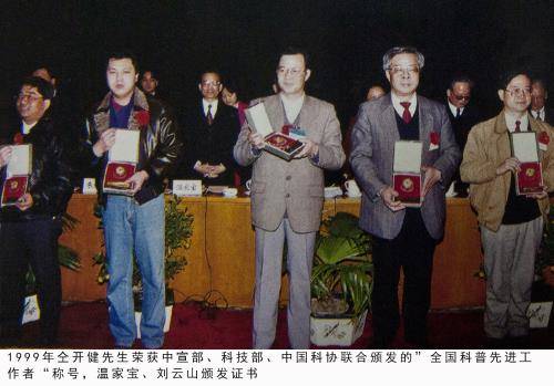 01:1999年仝开健先生荣获中宣部、科技部、中国科协联合颁发的”全国科普先进工作者“称号,温家宝颁发证书