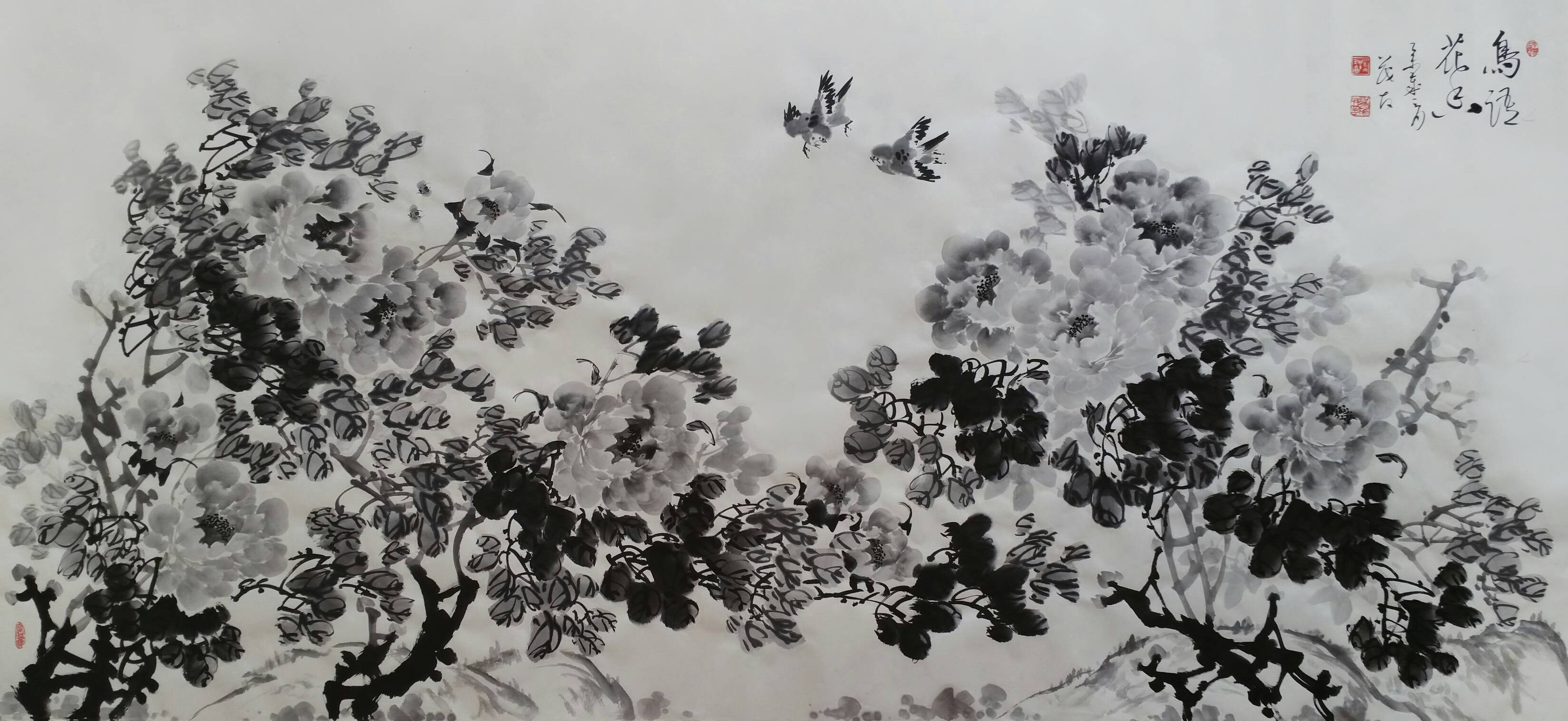 蔡茂友巨幅水墨牡丹《鸟语花香》2.3米X1.1米